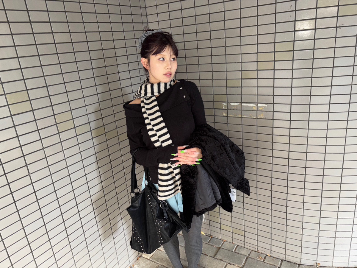 トップス・マフラー・バッグは今回の新作アイテムを使用しています。