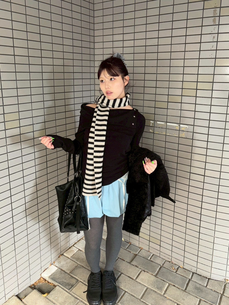 全体を黒やグレーの同系色でまとめつつ、水色のパンツとボーダー柄のマフラーをコーデのアクセントにしました。
