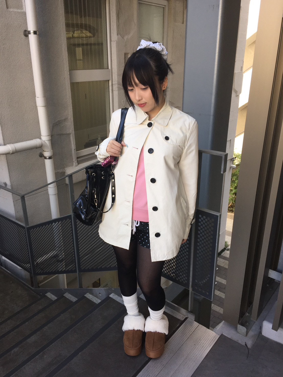 ホワイトのコートにブラウンのムートンブーツを合わせ、冬らしさたっぷりのキュートなスタイリングに仕上げました。