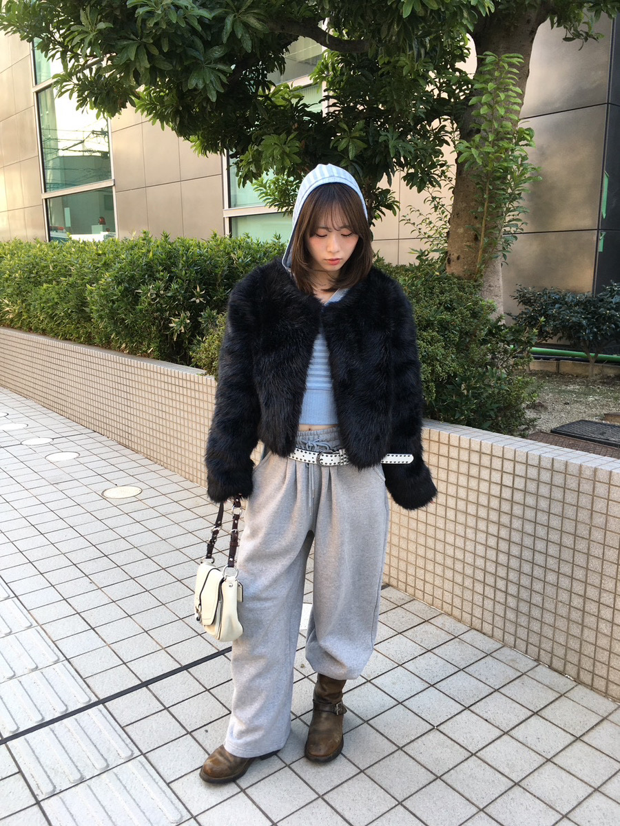 上品な印象のファージャケットもスウェットパンツと合わせてベルトでウエストマークすることで、程よくカジュアルダウンした着こなしができます。