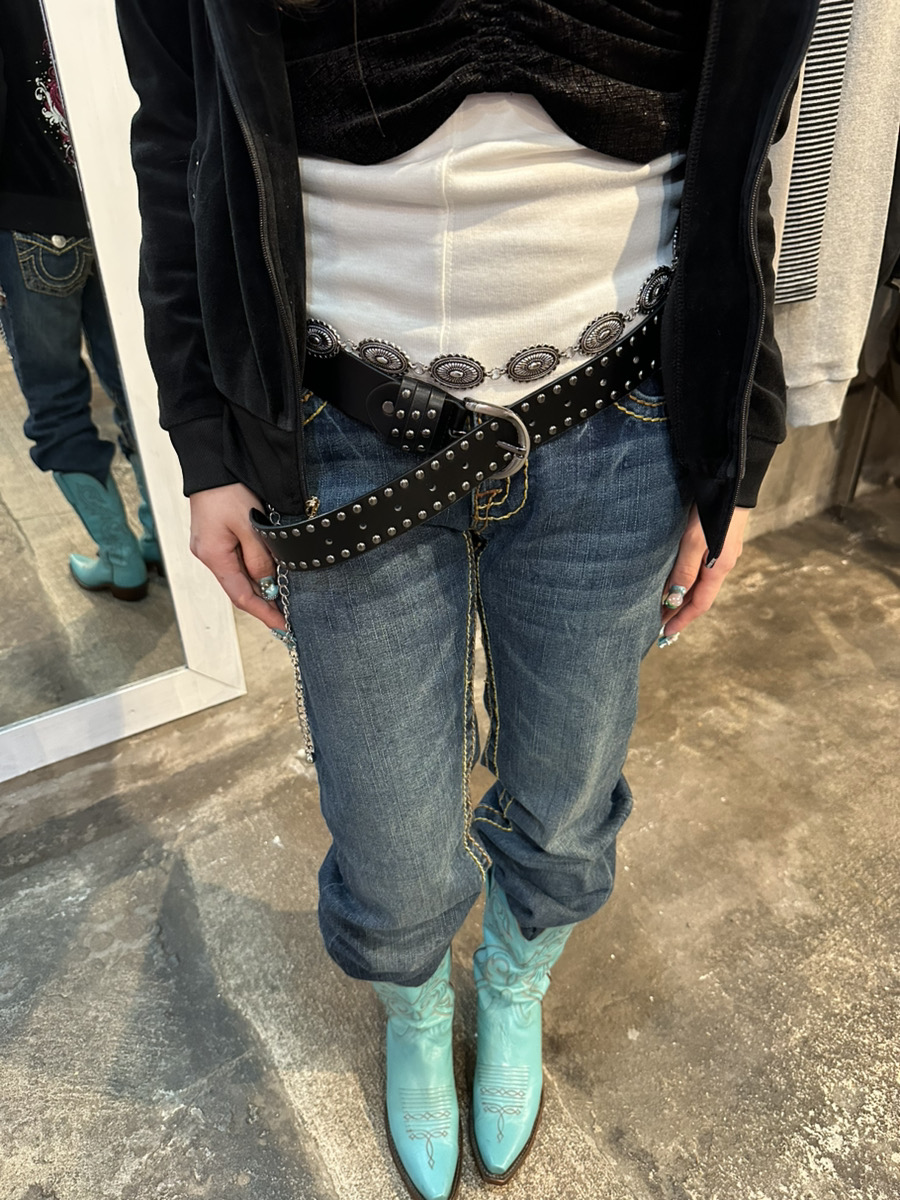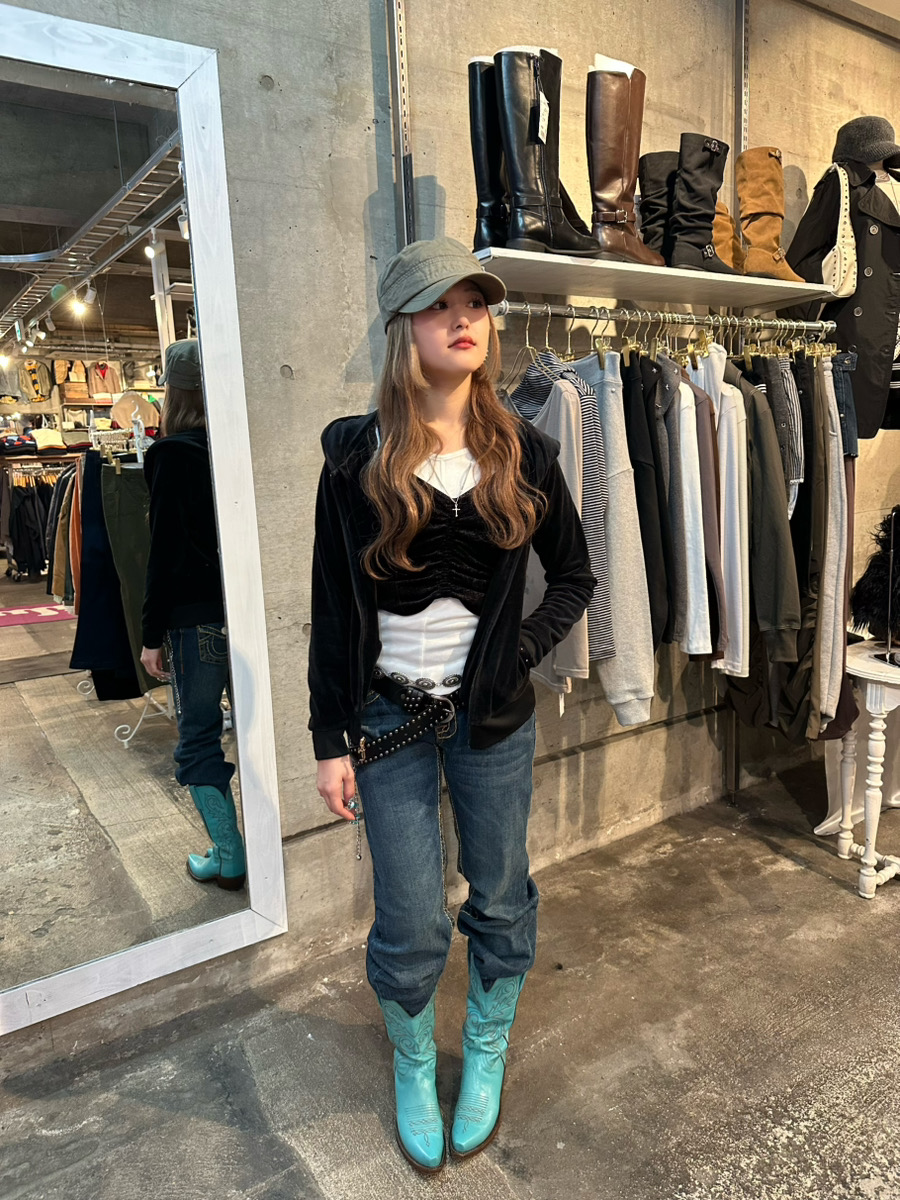 全体的なダークトーンの中にターコイズカラーのウエスタンブーツを入れることで、今っぽさが感じられるポイントになっています。