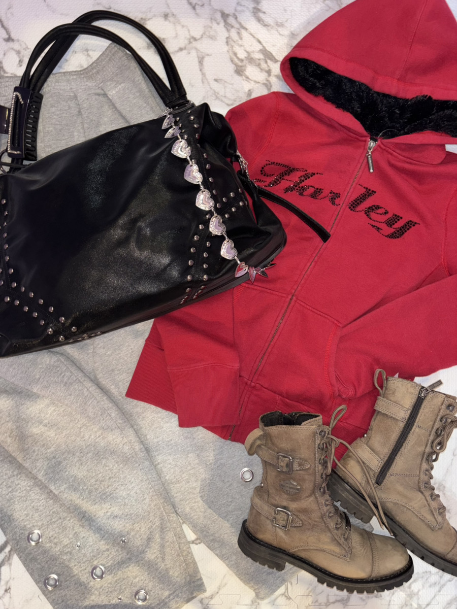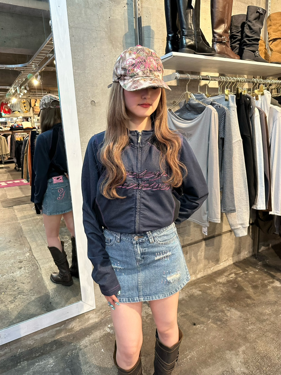Harley-Davidsonのネイビー×ピンクの色味、フロントジップがy2kらしさを感じさせます。