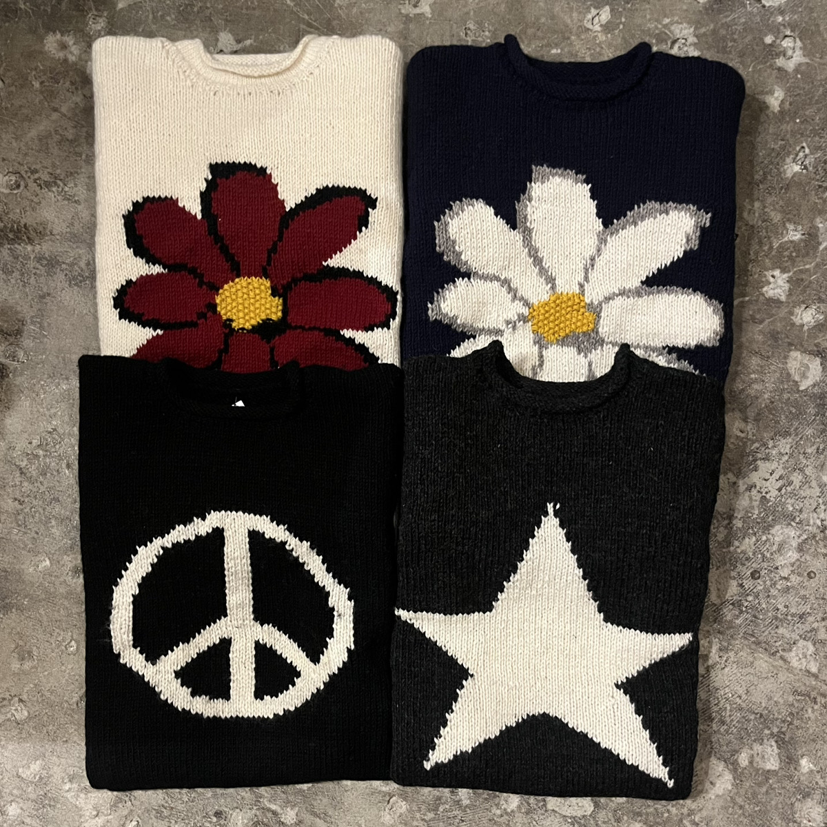 エクアドルニット4種類のうち、1つが福袋に入っていおります。フロント、バックにもお花やスター、ピースマークのモチーフのデザインのある男女共にかわいく着こなせるアイテムです。