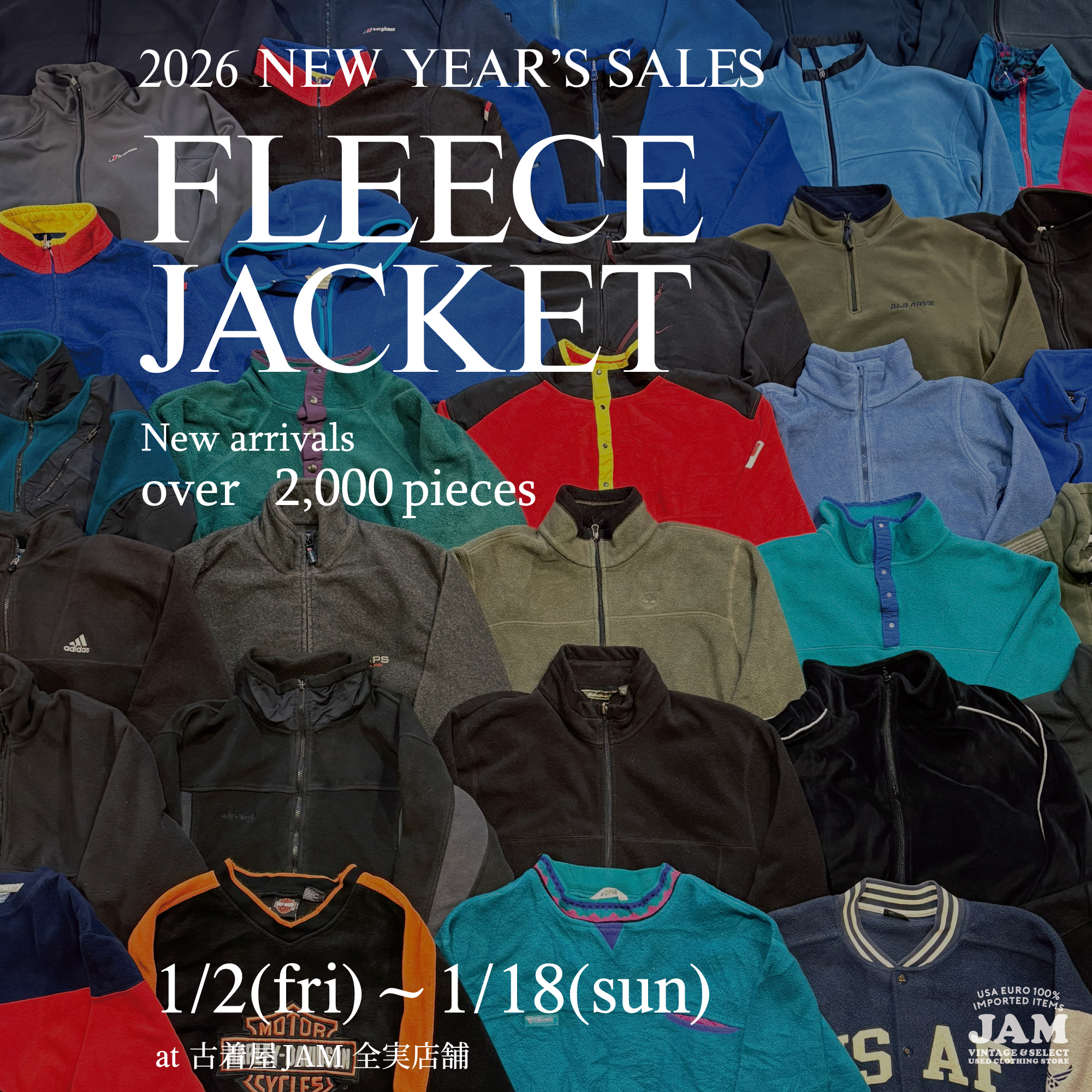 1/2(金)~1/18(日)の期間中、古着屋JAM全店でフリースジャケットを大量入荷しております。寒い冬の時期にインナーとしてぴったりのアイテムです。春先にはアウターとしても使える万能アイテムですのでお近くの古着屋JAMまでお越しくださいませ。