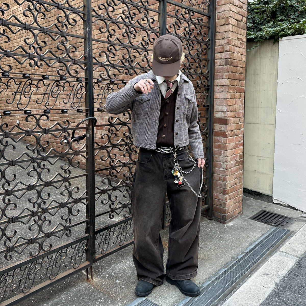 一つ目のスタイリングは、全体的にカラーをブラウンで統一感を出しつつ差し色でピンクのネクタイを選んでみました。ブラウンとピンクの組み合わせは上品さを持たすことができるのでストリートシック特有のおしゃれさを楽しむことができます。