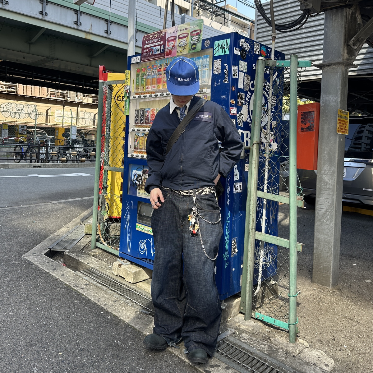 二つ目のスタイリングは、全体的に暗いトーンで合わせてあげ、差し色で青を選んでみました。ネクタイとキャップの色を合わせる事によって引き締まった印象とフレッシュな印象を同時にもたす事ができます。