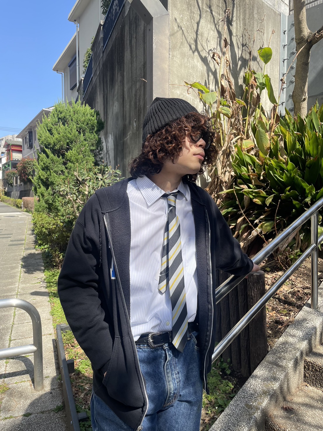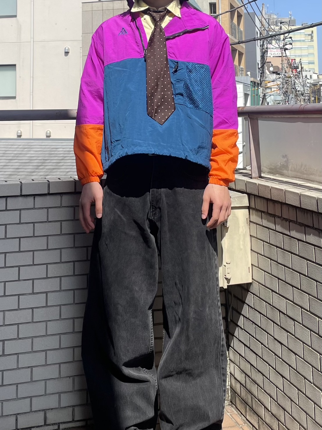 二つ目のコーディネートは、ブラックデニムに、カラフルなシャツネクタイ、ナイロンジャケットを組み合わせてみました。