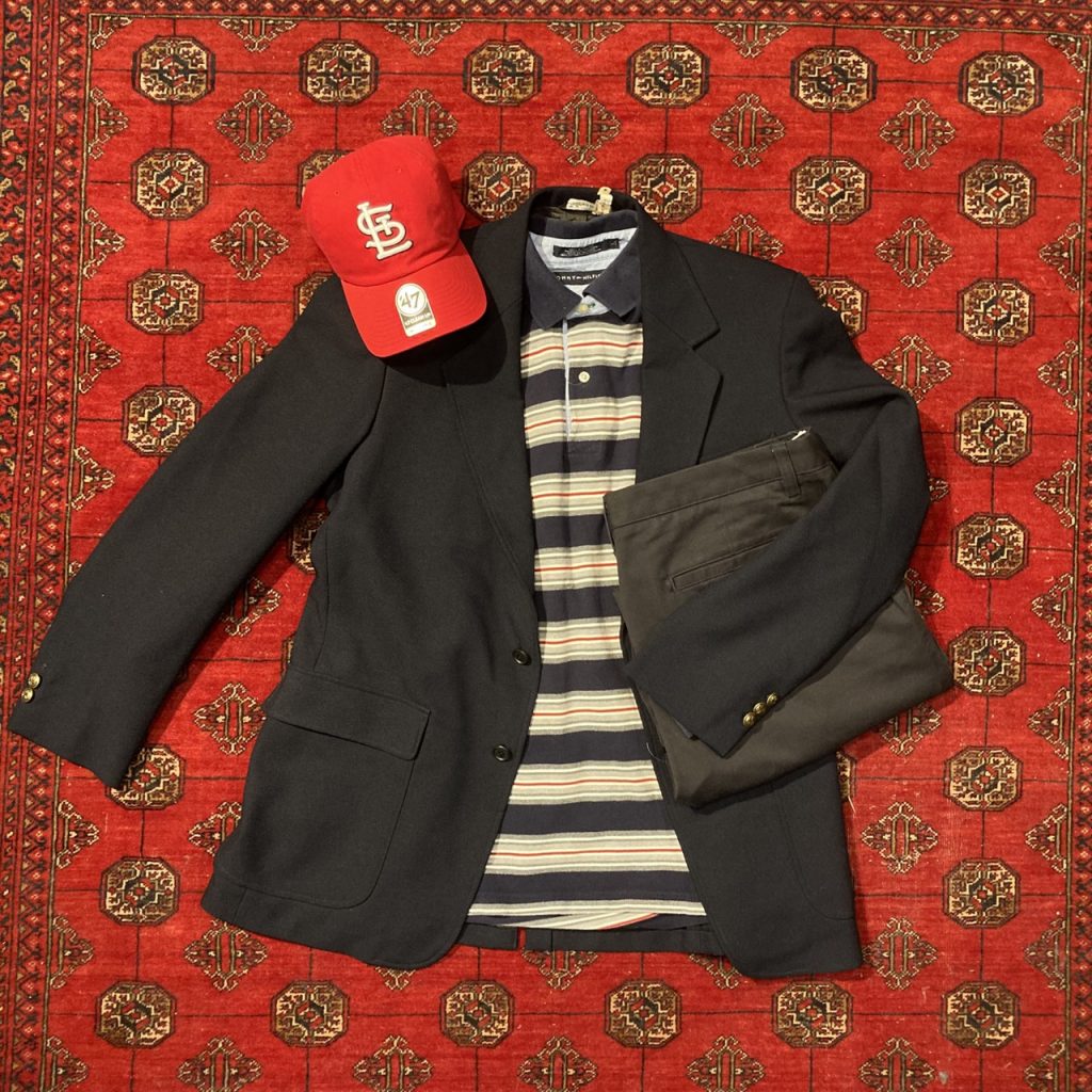 二つ目は、テーラードジャケットに長袖ポロシャツやキャップを取り入れ、よりカジュアルなコーデを組んでみました。