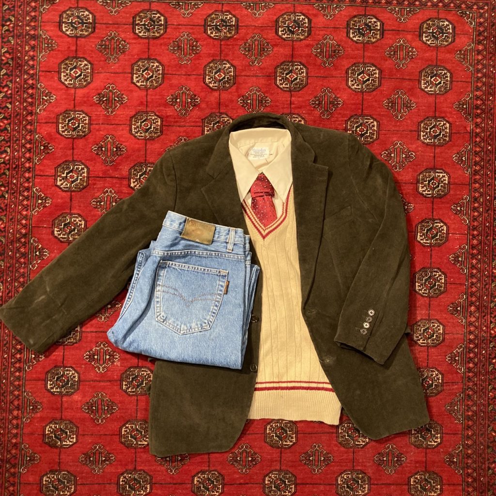 テーラードジャケット×シャツ×ニットベスト×デニム×ネクタイ