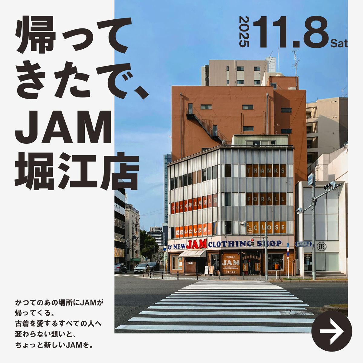 2025年11月8日(土)、私たちの原点ともいえる特別な場所・堀江に、再び「古着屋JAM 堀江店」がオープンいたしました!