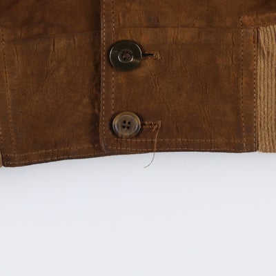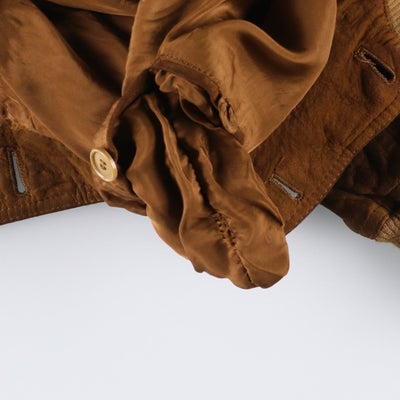 USEDレザーアイテムですので使用感、汚れ、擦れなどございますがレザーアイテムのリアルな表情として捉えていただきご注文御願いします。 【状態追記】 ●全体汚れ ●前、第8ボタン交換済み ●内、両脇・裾にリペア跡 ●前内側、右胸・腹部・左腹部ポケット内にリペア跡 左胸に裂け 左腹部に糸引き 左裾に汚れ ●後内側、右腰に裂け
