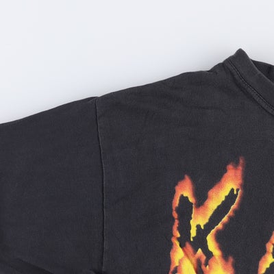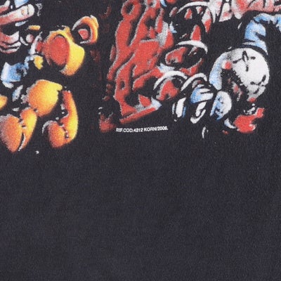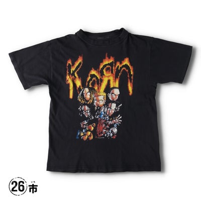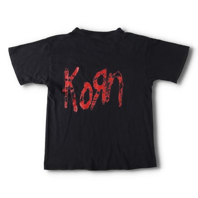 2000年代製、KORNのバンドTシャツ。フロントにバンドロゴとアートワークがプリントされ、ニューメタルの象徴的存在を表現。ロックファッションやストリートスタイルにマッチする一枚。