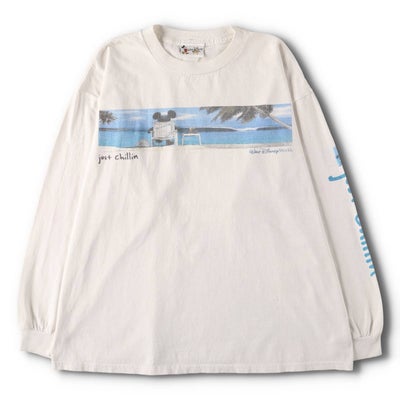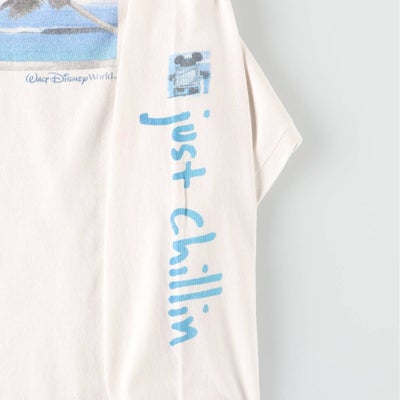 ~00年代 WALT DISNEY WORLD ミッキーの抜け感があるプリントTシャツです。海を眺めるミッキーのアートワーク。袖の「just chillin」のプリントもGOODです。春夏に相性が良いGOODプリントの一着です。