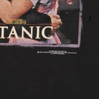 90年代 TITANIC ムービーTシャツです。『タイタニック』は、1997年公開のジェームズ・キャメロン監督作品で、レオナルド・ディカプリオとケイト・ウィンスレットが主演を務め、世界中で歴史的な大ヒットを記録した作品。こちらはあまり見かけないパターンのプリントかなと思います。是非◎