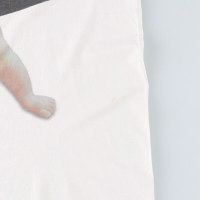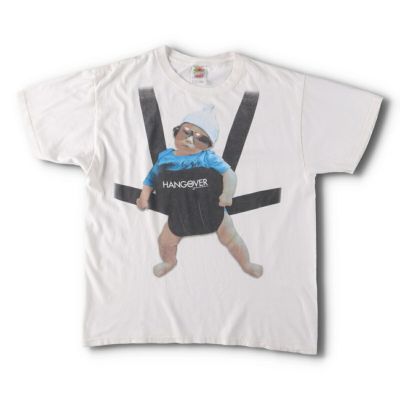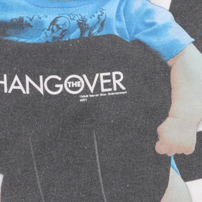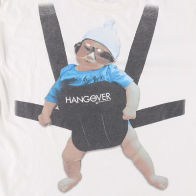画像は、2000年代FRUIT OF THE LOOM(フルーツオブザルーム)製の映画『ハングオーバー! 消えた花ムコと史上最悪の二日酔い』ムービーTシャツ。キャラクターであるサングラスをかけた赤ちゃんがベビーキャリアに入っている姿がプリントされたデザイン。当時にプロモーション用のTシャツとしても貴重な一着です。お好きな方は是非。