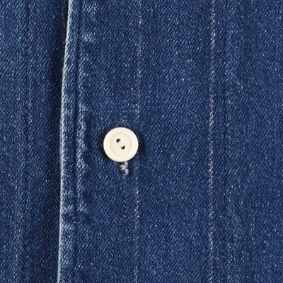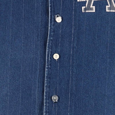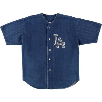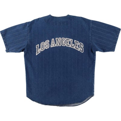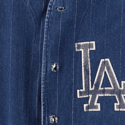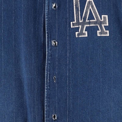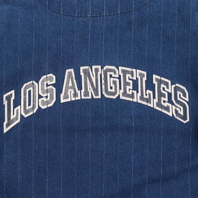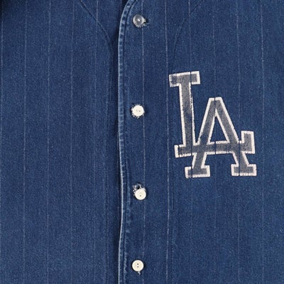 半袖のデニムストライプ地のベースボールシャツというだけでも珍しいですが、ドジャースを連想させるLA(Los Angels)のプリントがWBCもあった今良きです。おそらくドジャースファンがスーベニアもしくは個人で作られたものだろうという勝手なバックボーンのイメージや、ストライプ地のところがプリント剥げがでてきているところも、経年変化を感じてなかなかでない珍品です。