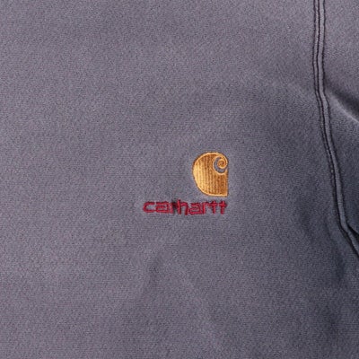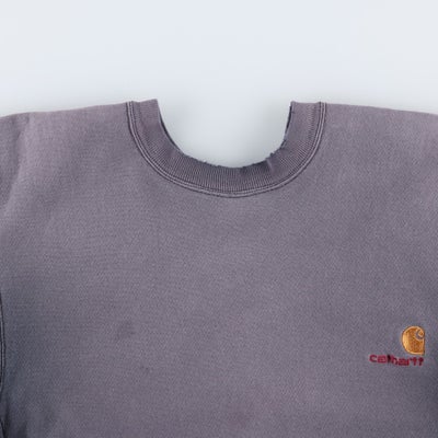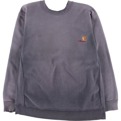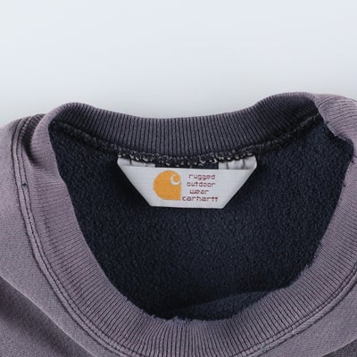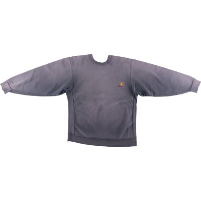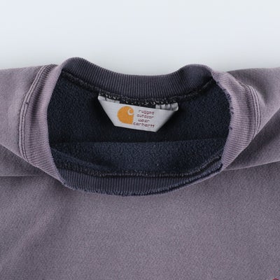 カーハート(Carhartt)のロゴスウェットシャツです。80~90年代頃の希少なヴィンテージアイテムで、この年代特有の「rugged outdoor wear」表記の一着。絶妙に褪せたボディが、ヴィンテージならではの抜群の雰囲気を醸し出しています。左胸にはブランドを象徴するCロゴとブランド名が刺繍されており、シンプルなデザインの中にも確かな存在感があります。サイドのリブ切り替えなど、リバースウィーブを彷彿とさせるタフなディテールも魅力。肉厚でタフな生地感は、ワークブランドであるカーハートならではの仕上がりです。メンズL相当のゆったりとしたサイズ感で、現代のストリートスタイルにも馴染む、武骨さと洗練さを兼ね備えた逸品です。