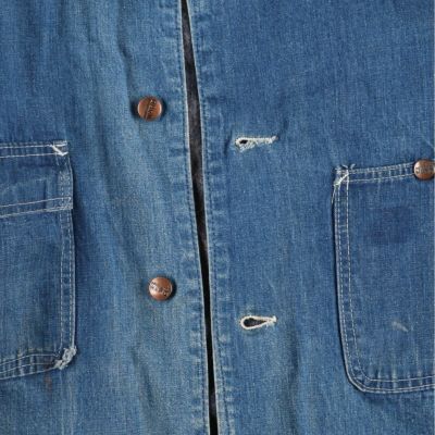 ●前、第2ボタンホールほつれ、下ポケットステッチ糸抜け、左肩に擦れ