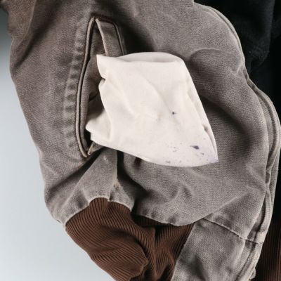 ●前、襟ぐり・襟下・ジップレーン横・右ポケット内・左袖口に汚れ