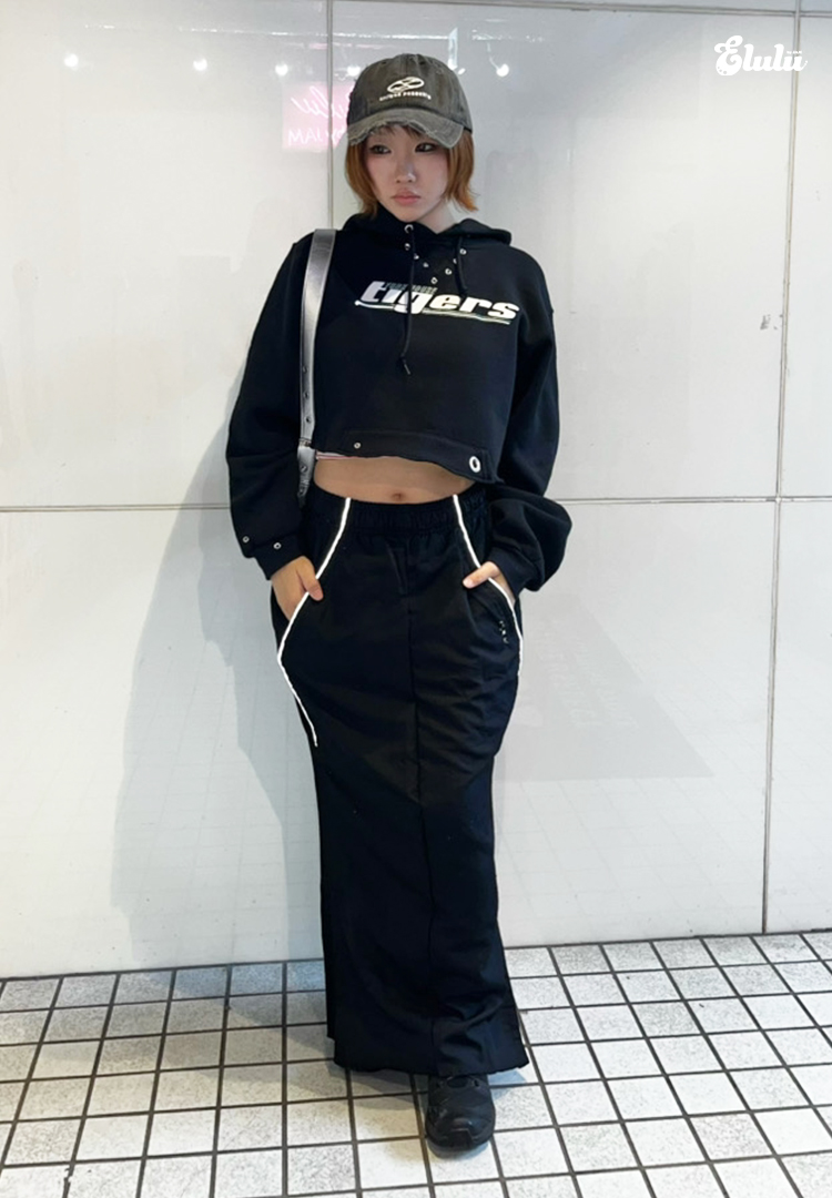 全体的にスポーティーな雰囲気を意識してコーデを組んでみました。人気のハトメクロップドパーカーを使いモノトーンをベースにキャップやバッグ、スカートのラインなどでアクセントを加え、ラフに落とし込んだスタイルになっています!