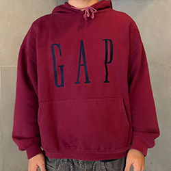 バーガンディのGAPパーカーを主役に、グレーの太畝コーデュロイパンツをゆったりと合わせた秋コーデです。ベージュのキャップでラフさをプラスし、抜け感のあるオータムリラックスコーデに仕上げています。