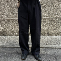 ロングコートとスラックスのフォーマルなスタイルに、ミリタリー要素をミックスしてみました。軍物の無骨な印象とスウェットのラフさを、ボトムスを黒で統一することで違和感なくまとめています。雰囲気を近づけるために、スウェットをアニマル柄にしている所もポイントです。