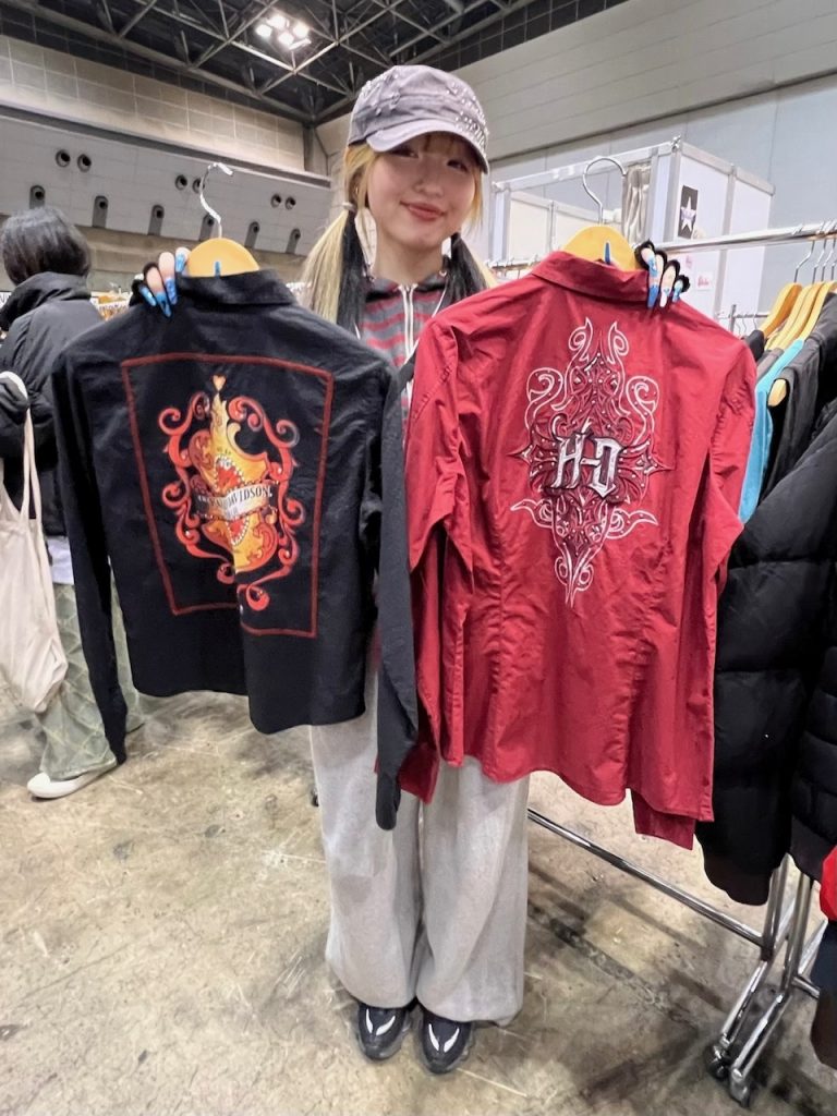 原宿店の店長、高橋唯蕗さんが手にしていたのは、「Elulu by JAM(エルル バイ ジャム)」で取り扱うハーレーダビッドソンのシャツ。背中に大胆な刺繍が施され、力強さと華やかさを併せ持つデザインです。女性からの支持も高いそうです。Eluluでは古着に加え、韓国ブランドの新品も扱っていて、古着とのミックスが楽しめます。店長の着こなしも、フーディーは古着、パンツは韓国ブランドの新品という好バランスでした。
