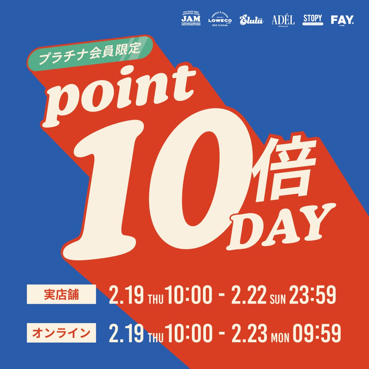 全実店舗およびオンラインストアにて「プラチナ会員限定!ポイント10倍!」キャンペーンを実施いたします。