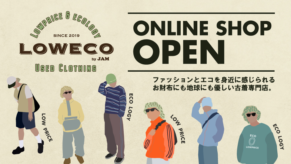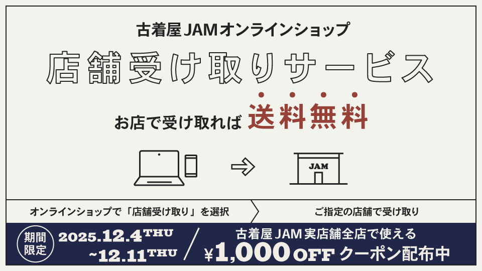 オンラインショップと実店舗の合同キャンペーンを開催!オンラインで注文し、店舗で受け取ると、古着屋JAM実店舗全店で使える特別クーポンをプレゼント。この機会をお見逃しなく!