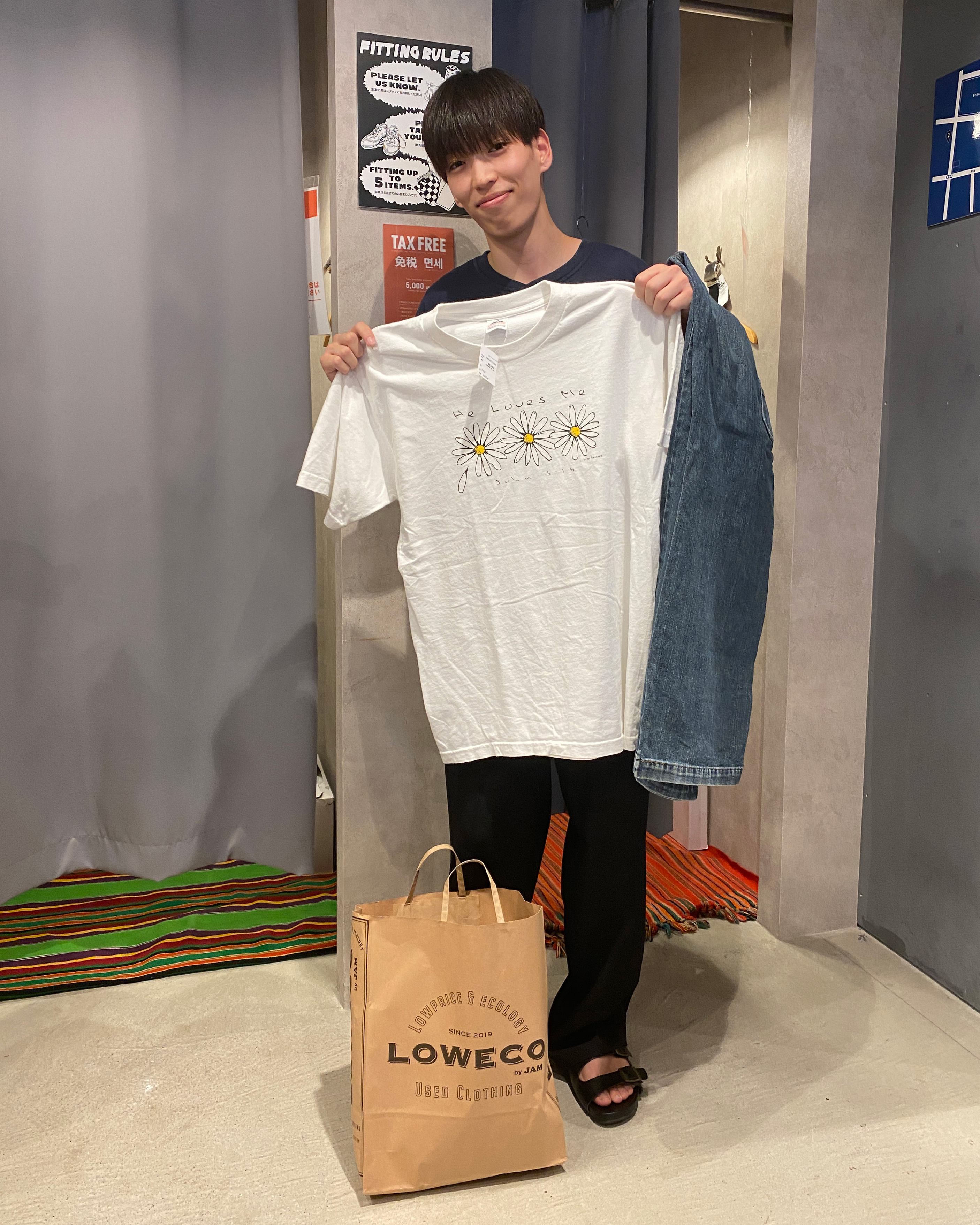 LOWECOでは、グラフィックTシャツに一目惚れ!来店してすぐ購入を決めたそう。社会人になってからは値段を気にせず買えるようになり今日も4点ほど購入してくださっていました。遊びに行く機会も減ったという彼は遊ぶ日のために買うという買い方に変わっていったそうです。先日も古着を着て琵琶湖花火大会やバーベキューなど夏を満喫しておられました!