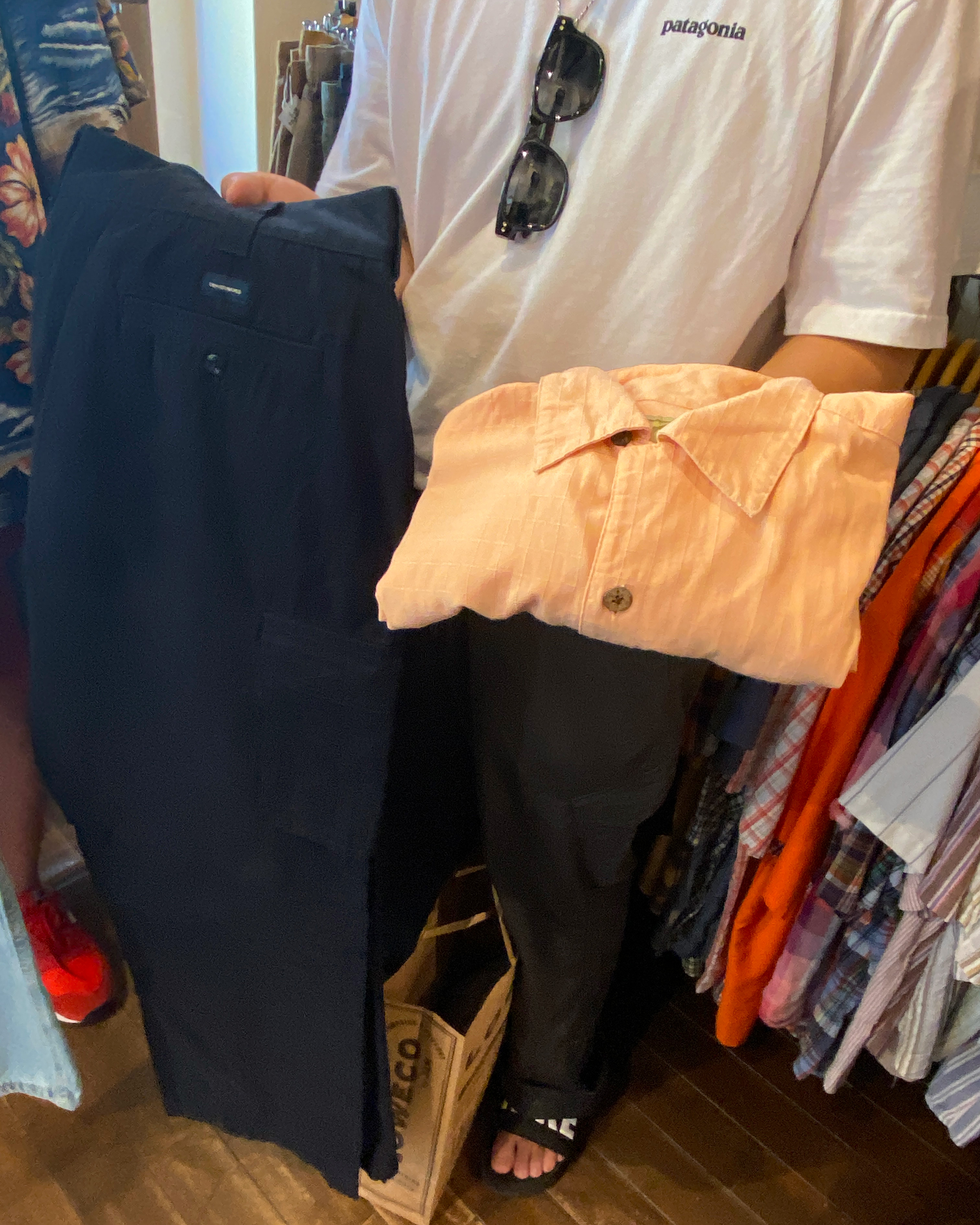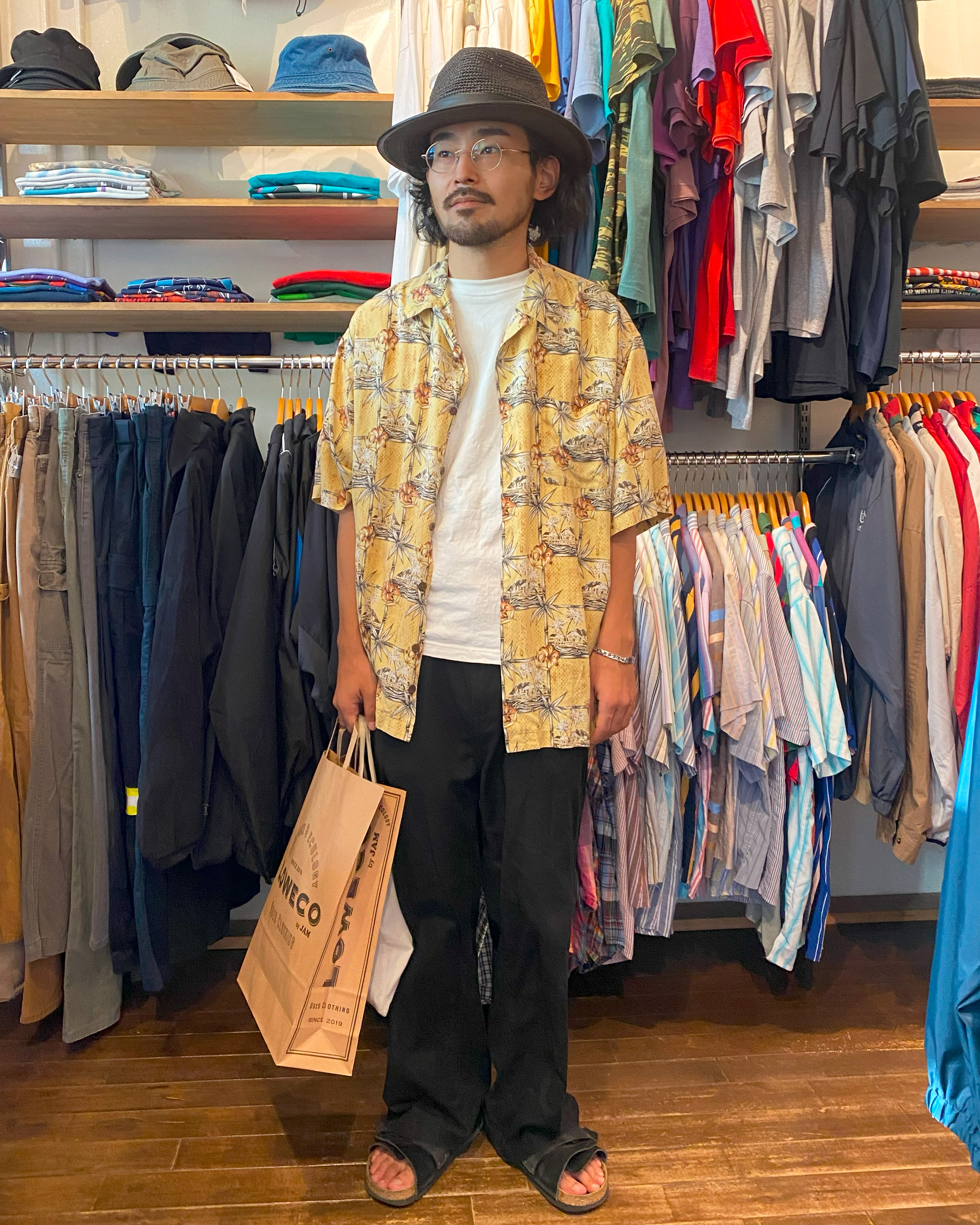 とってもお似合いだな〜と思っていたこの黄色のシャツは、なんと入店後何点か見ている中、一目惚れをしたというアロハシャツでした。試着しそのまま購入してくださりました(笑)それ以外は試着してないというほど即決だったそうです!
