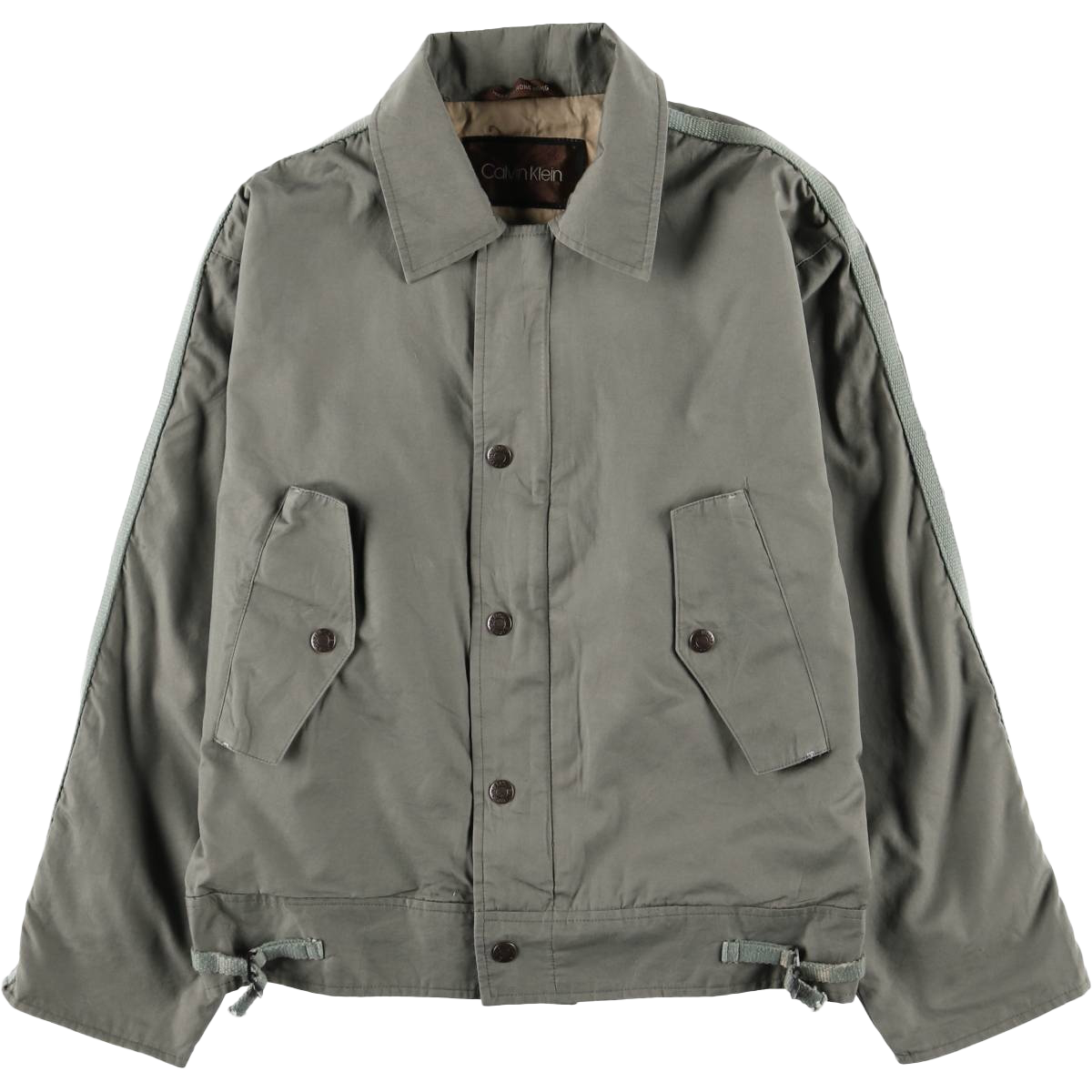 80~90年代に作られたカルバンクラインのジャケットです。イギリス空軍のフライトジャケット『MK3』をオマージュしたようなデザインです。光沢感のある素材をしており、かつ短文で、トレンド感のあるジャケットです。