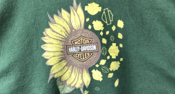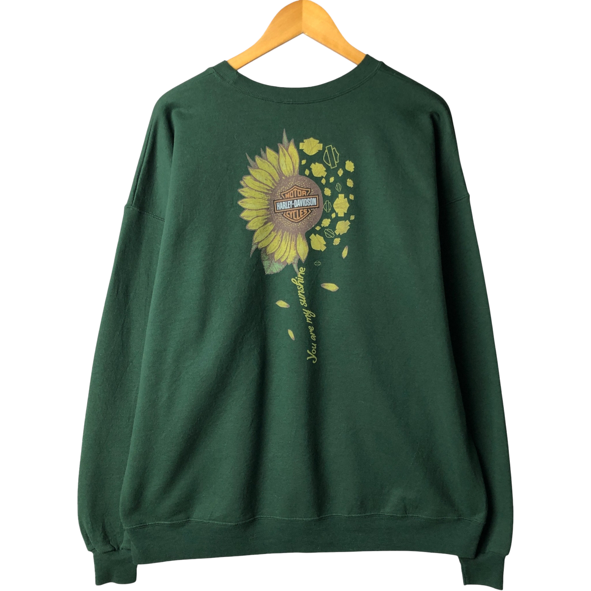 90年代頃のハーレースウェット。一見ひまわり柄のようですが、中央にはバー&シールドロゴが入り、花びらのように散るロゴが印象的。ハードな印象の多いハーレーの中でも、優しさと遊び心を感じるデザインで、とても魅力的な一着です。