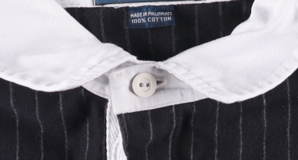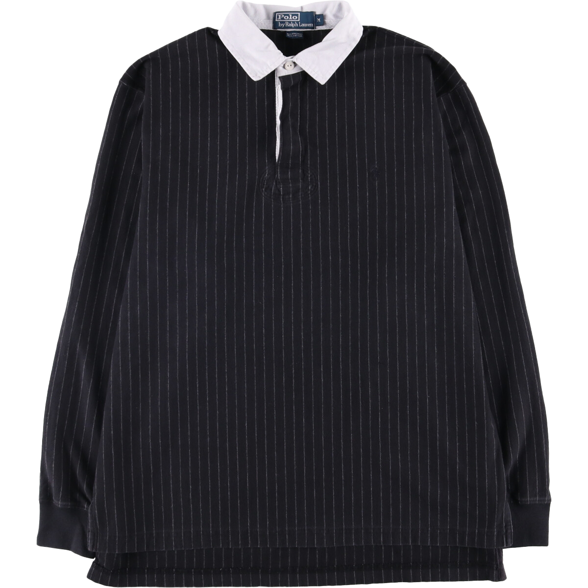 90年代頃ラルフローレンのラガーシャツです。白襟、ゴムボタンなどラガーシャツの特徴はしっかりとデザインされながらも珍しいチョークストライプ柄でシックな印象を受けます。さりげない同色ポニーも雰囲気にマッチしている一着です。