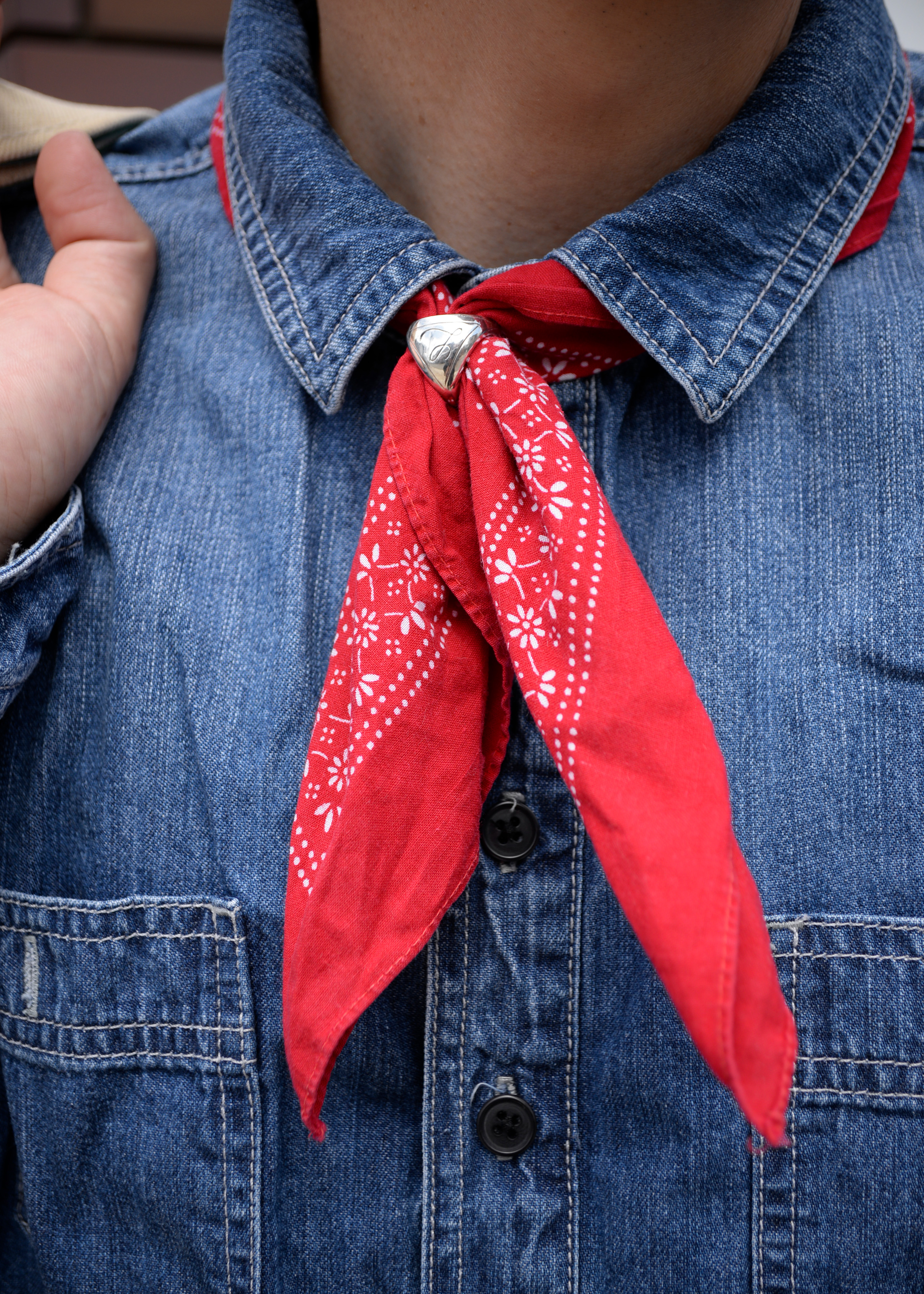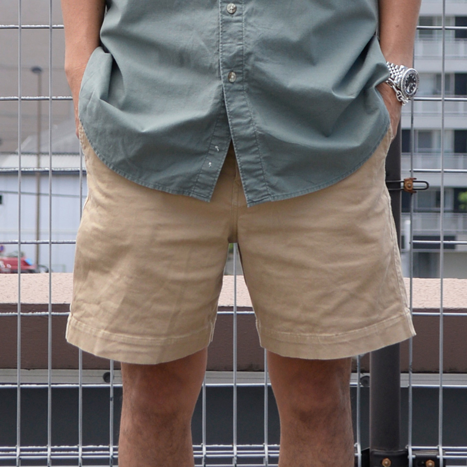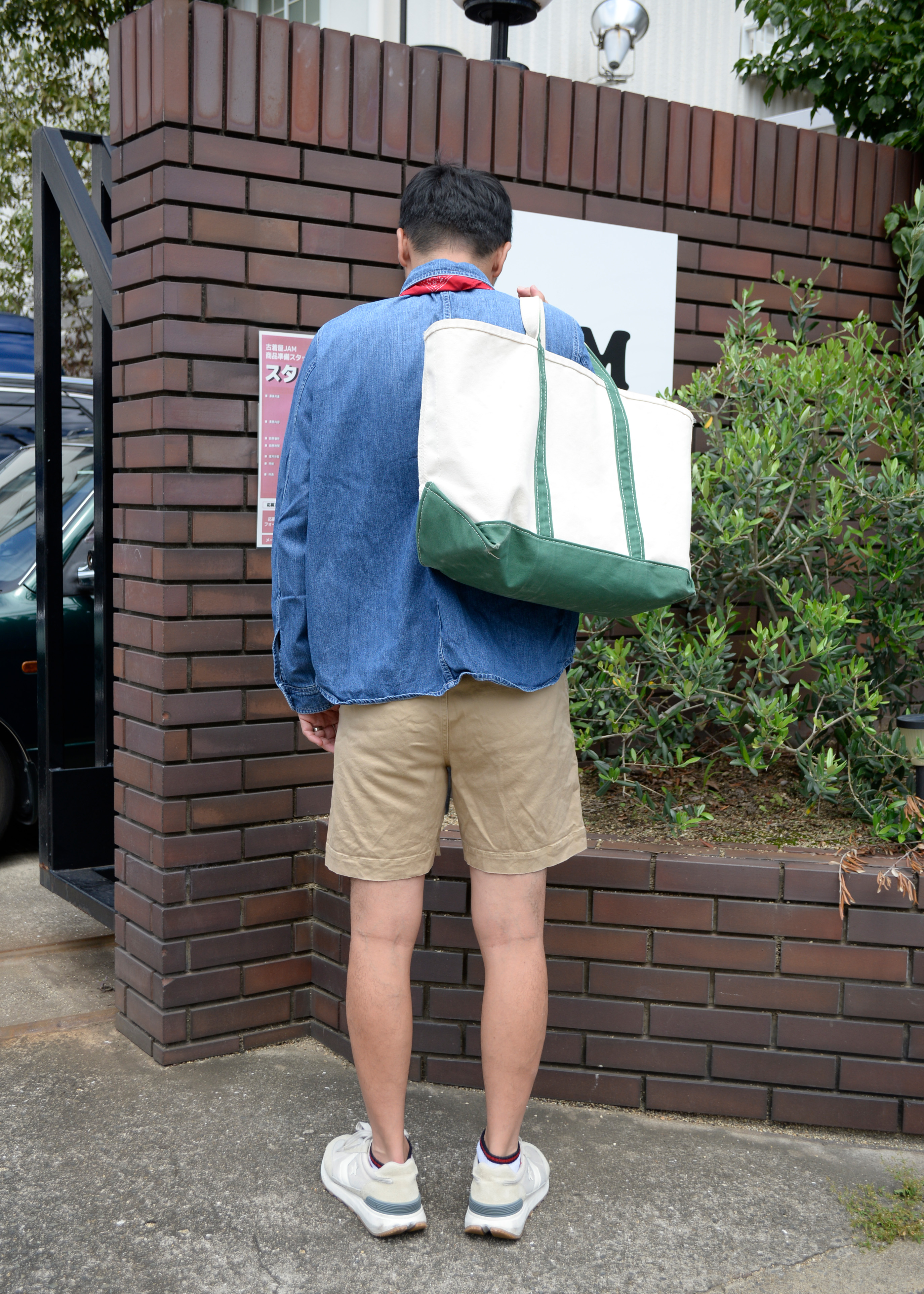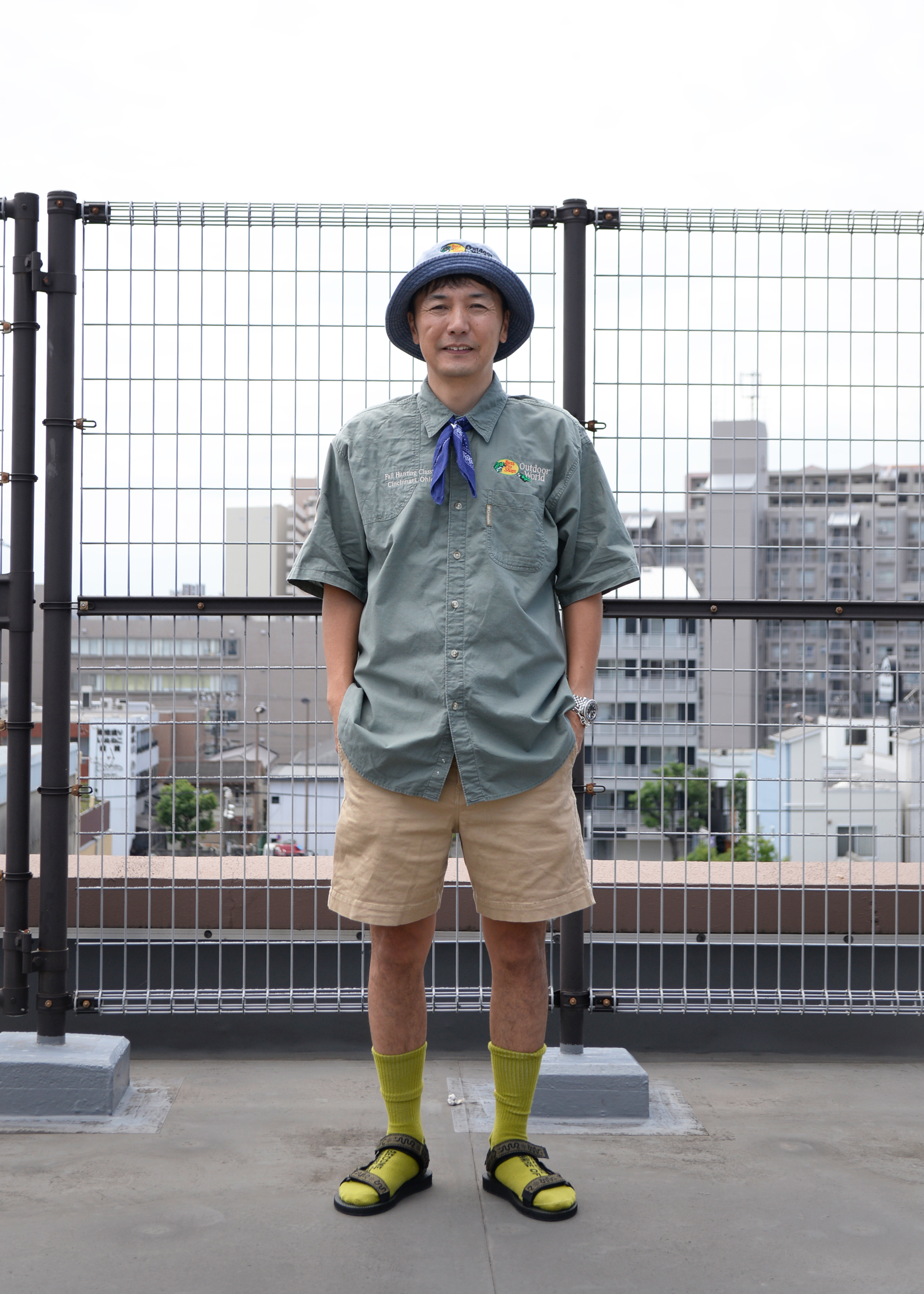 ボトムスはショートパンツでカジュアルな印象ですが、トップスのデニムシャツとバンダナでうまくバランスをとりカジュアルになりすぎないスタイリングになってます。