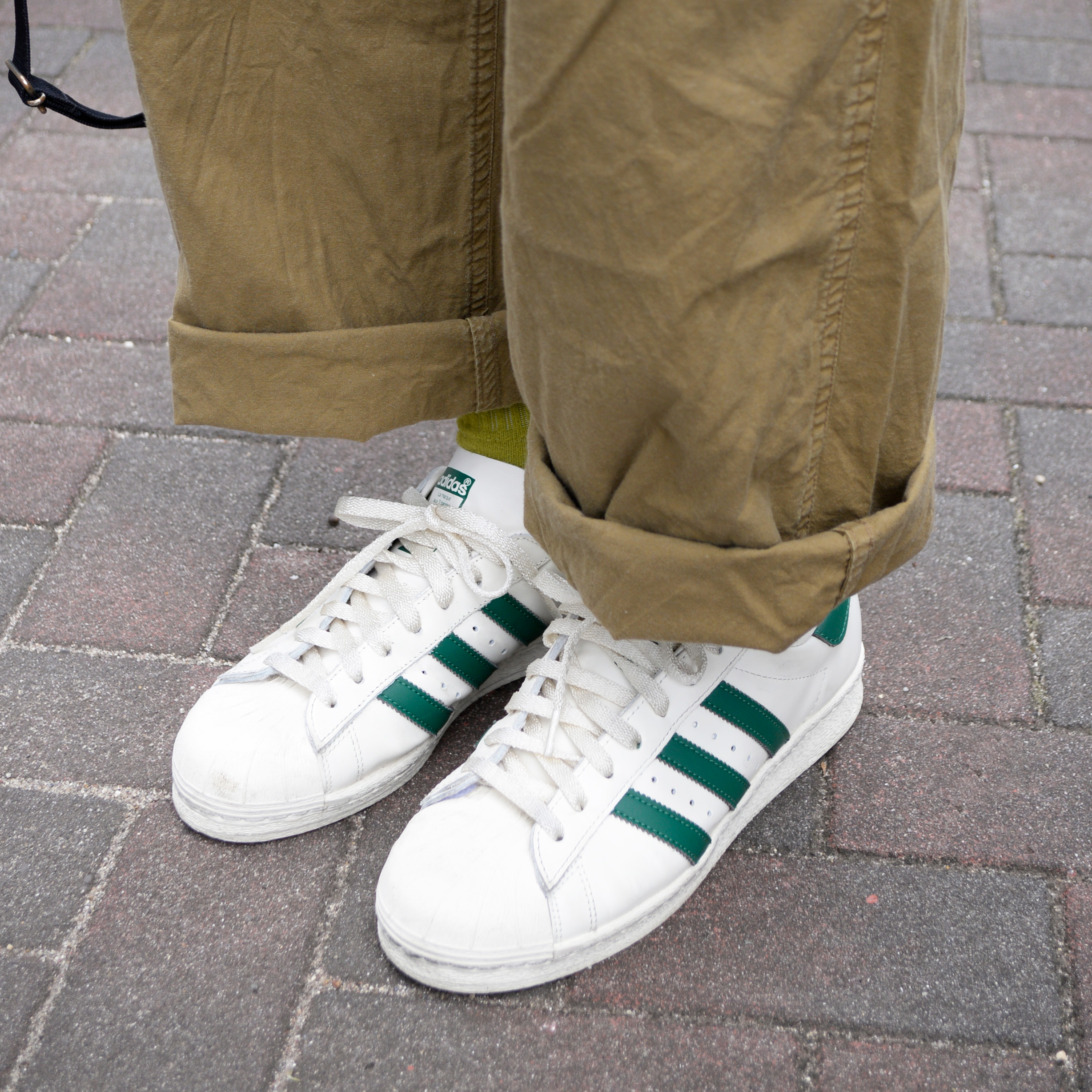 フォーマルな白シャツとカジュアルなカーゴパンツやスニーカーの組み合わせで、上品さとリラックス感をバランス良く取り入れたスタイルです。