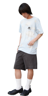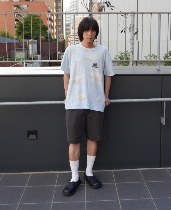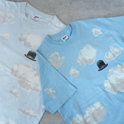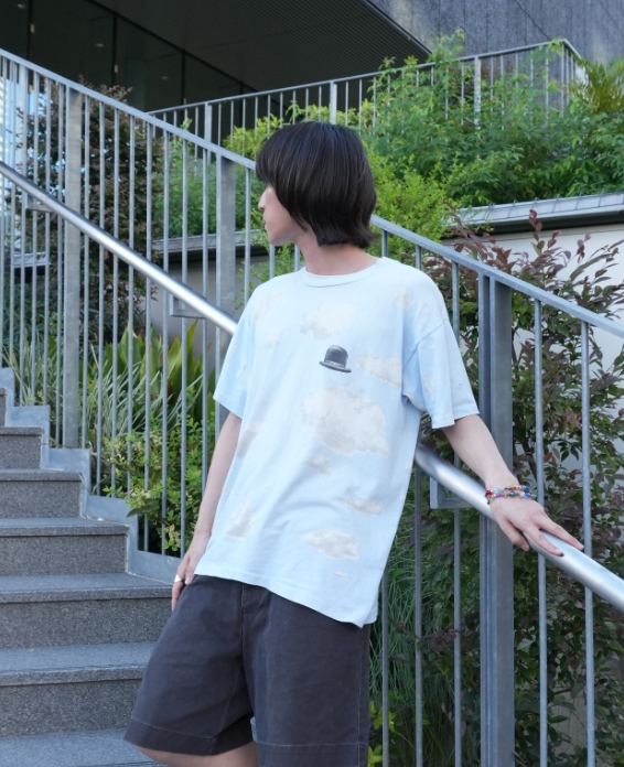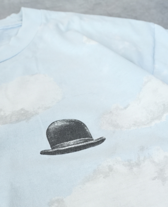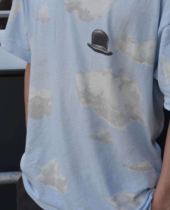 全面に広がる青空の中で左胸にポツンとある三高帽がでマグリットへのリスペクトを感じるGOODデザイン、オールオーバープリント特有の派手さが程よく薄れたGOODフェード、さらにLサイズとマイサイズに出会い「これは買うしかない!!」と即決でした。