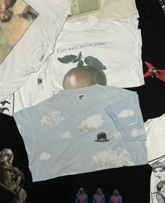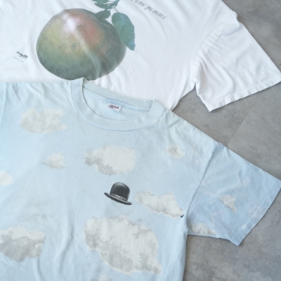 彼の作品を通して、私は表面的な情報や常識を疑う視点を持つようになりました。Tシャツを見るときも「古いボディだから本物」と決めつけず、プリントの質感や製造時期など細部に目を向けるようになり、1枚のTシャツに対する考察がより深く面白くなりました。「これはリンゴではない」のTシャツは持っていますが、「イメージの裏切り」はマイサイズが見つからず、まだ探しています。