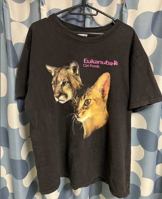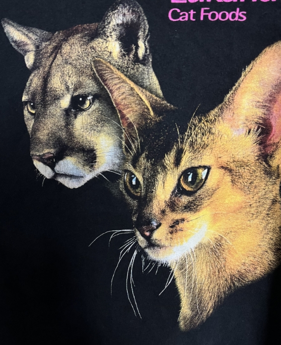このTシャツに惹かれた理由は実写の猫プリントだったからです!またドッグフード・キャットフードのアドバタイジングTという点も大変くすぐられポイントです!