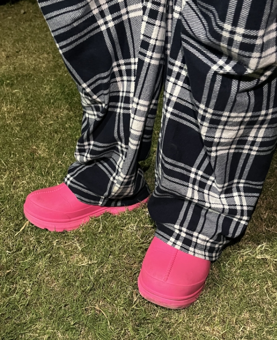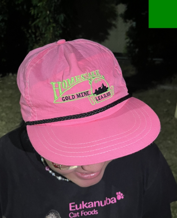 このTシャツは、2匹の猫とメッセージ部分のピンクがアクセントになっているので、その色を帽子とサンダルでカラーリングを拾った、組み合わせを意識しました。