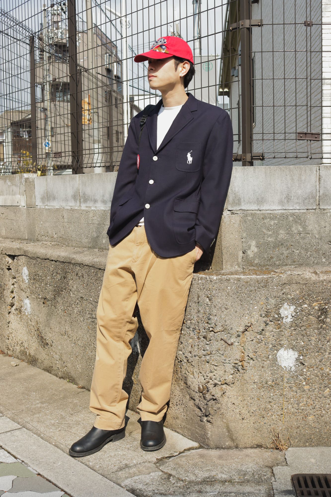 新生活の気分を凛とさせてくれる、ラルフローレンのテーラードスタイル。一見ハードルが高そうなジャケットも、キャップや白Tシャツでカジュアルに崩せば、古着初心者でも挑戦しやすい親しみやすい表情になります。チノパンと組み合わせることでアメトラ感が表現でき、カジュアルとフォーマルのバランスが取れたスタイリングにできます。
