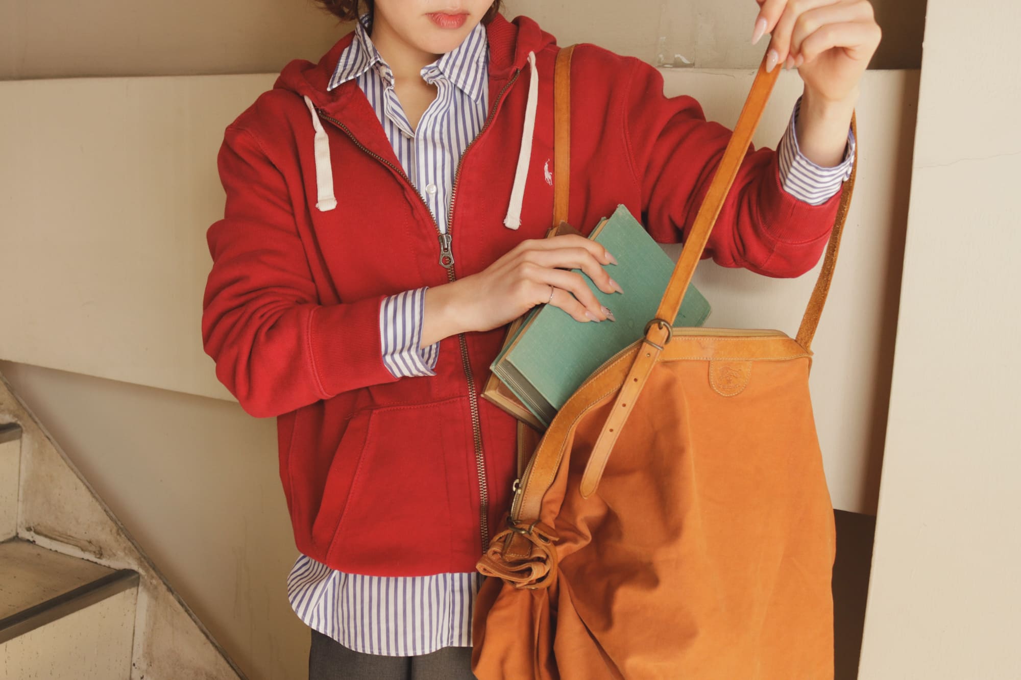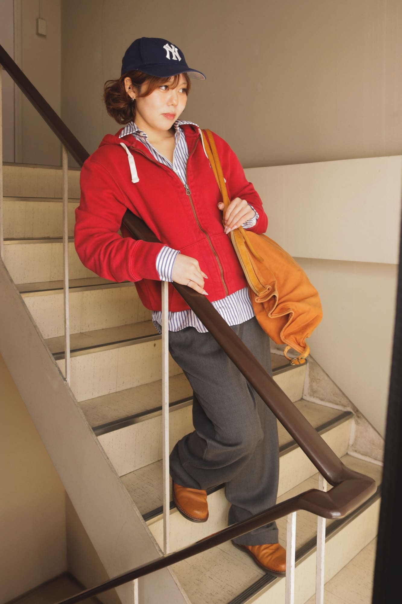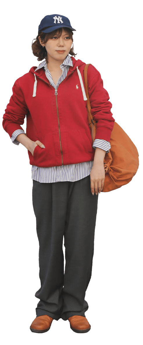 肌寒い春の朝晩に欠かせないジップアップパーカーを、ストライプシャツと合わせることでフォーマルな印象になります。カジュアルになりがちなスウェット素材も、シャツを襟元から見せるだけで、新生活にふさわしい「きちんと感」が生まれます。ボトムにはあえて上品なグレーのスラックスをチョイス。キャップやレザーシューズで小物使いを効かせるのが、古着初心者でも真似しやすいおしゃれの近道です。等身大の自分でいられる、リラックスしたスタイルを楽しんでみてください。