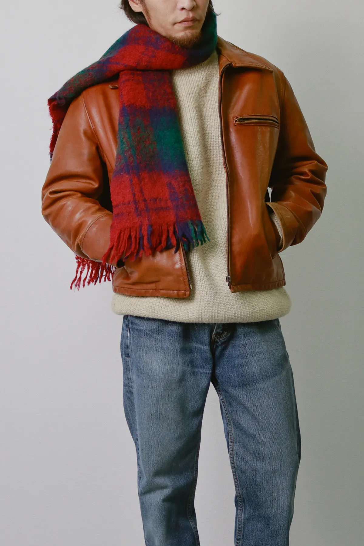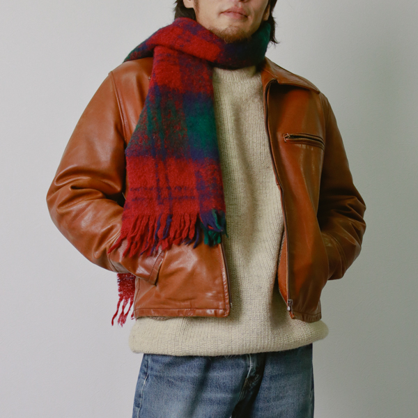 タフなレザージャケットに、肉厚なニットセーターを合わせて冬仕様に。レザーの風格を活かしつつ、柔らかなニット素材で大人の余裕を演出します。首元にボリュームを出す、冬アウターの価値を最大限に引き出す最高の組み合わせです。