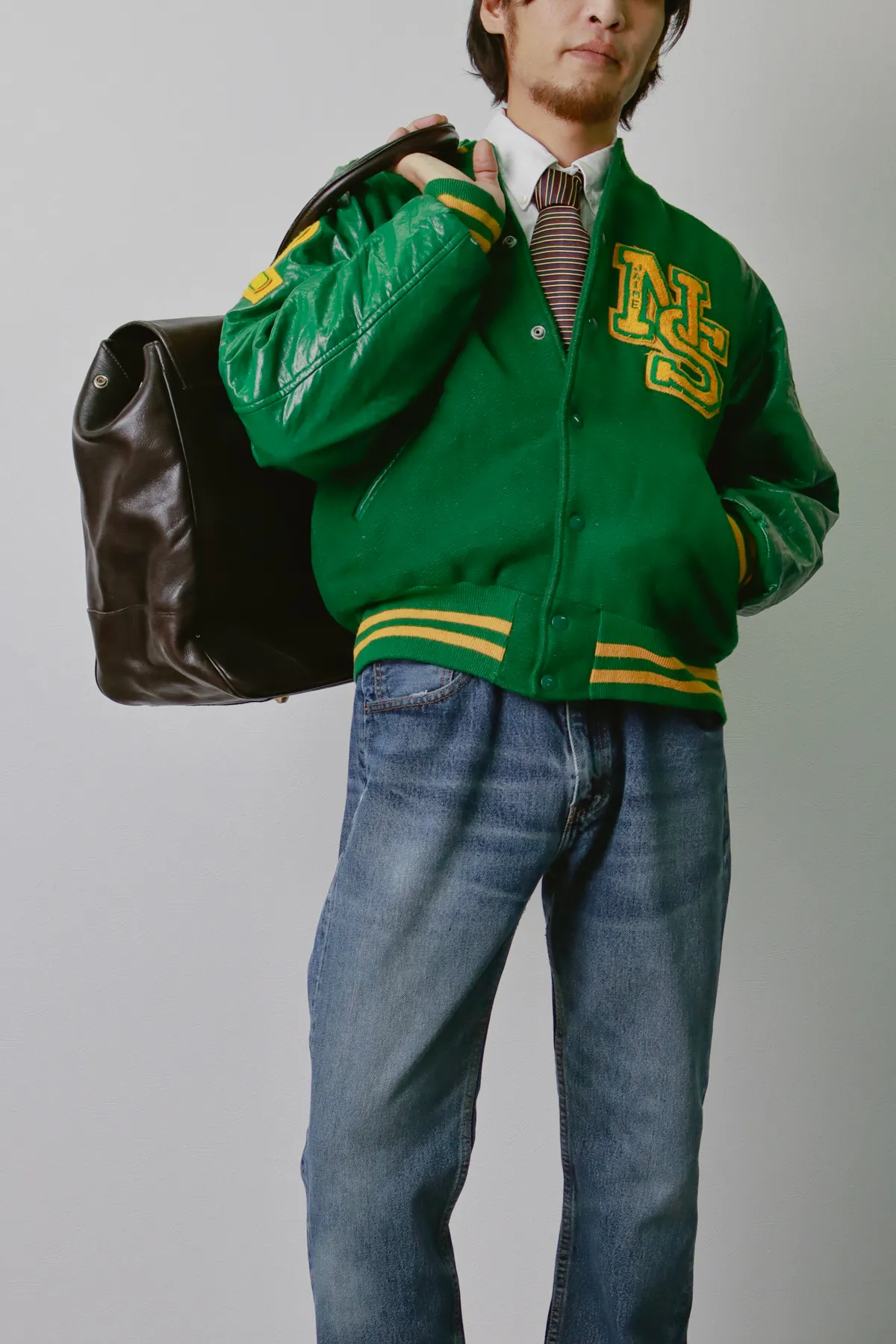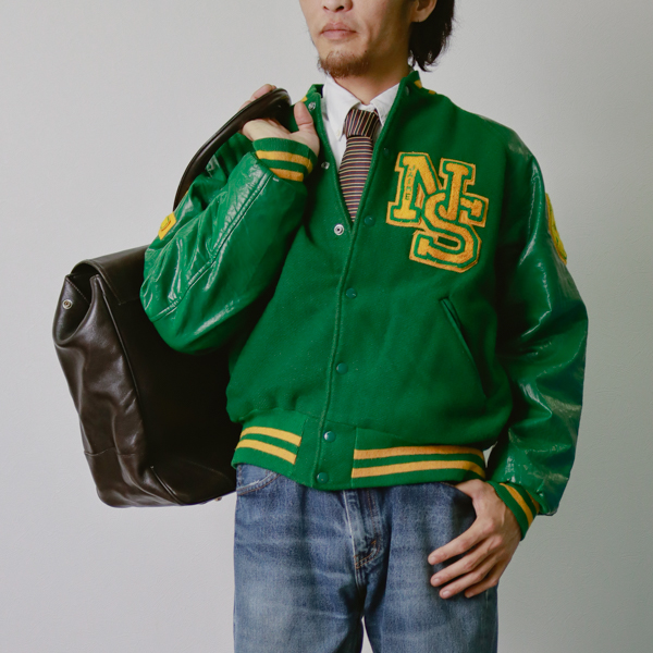 個性が光るスタジャンを、無地の長袖シャツとタイで大人仕様にアップデート。インナーに襟付きを合わせることで、アメカジアイテムが一気に知的な印象へ。スタジャンとシャツ、古着の醍醐味と洗練を両立する最高の黄金比です。