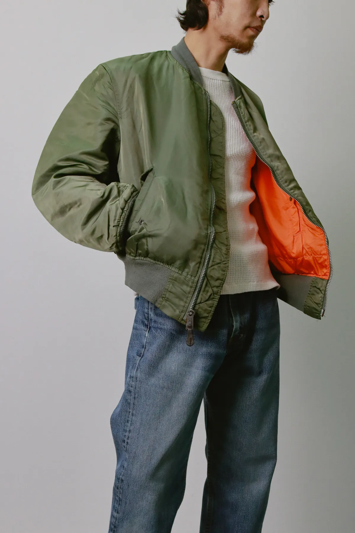 普遍的なミリタリーアウターを、サーマルでクリーンな印象に。野暮ったさを抑えて落ち着いた大人の雰囲気を演出します。インナーでアウターの存在感を引き立てる。この組み合わせが、冬の古着スタイルをすぐに格上げします。