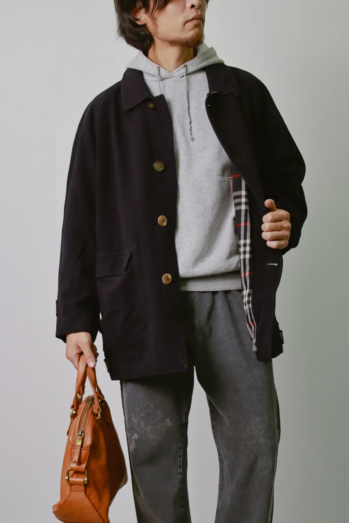 落ち着いた表情のウールコートを、あえてラフなスウェットパーカーで着崩すのが今の気分です。カジュアルダウンしすぎないよう、パーカーはグレーのワントーンを選択。このレイヤードこそ、冬の着こなしに奥深さを加える大人のこだわりです。