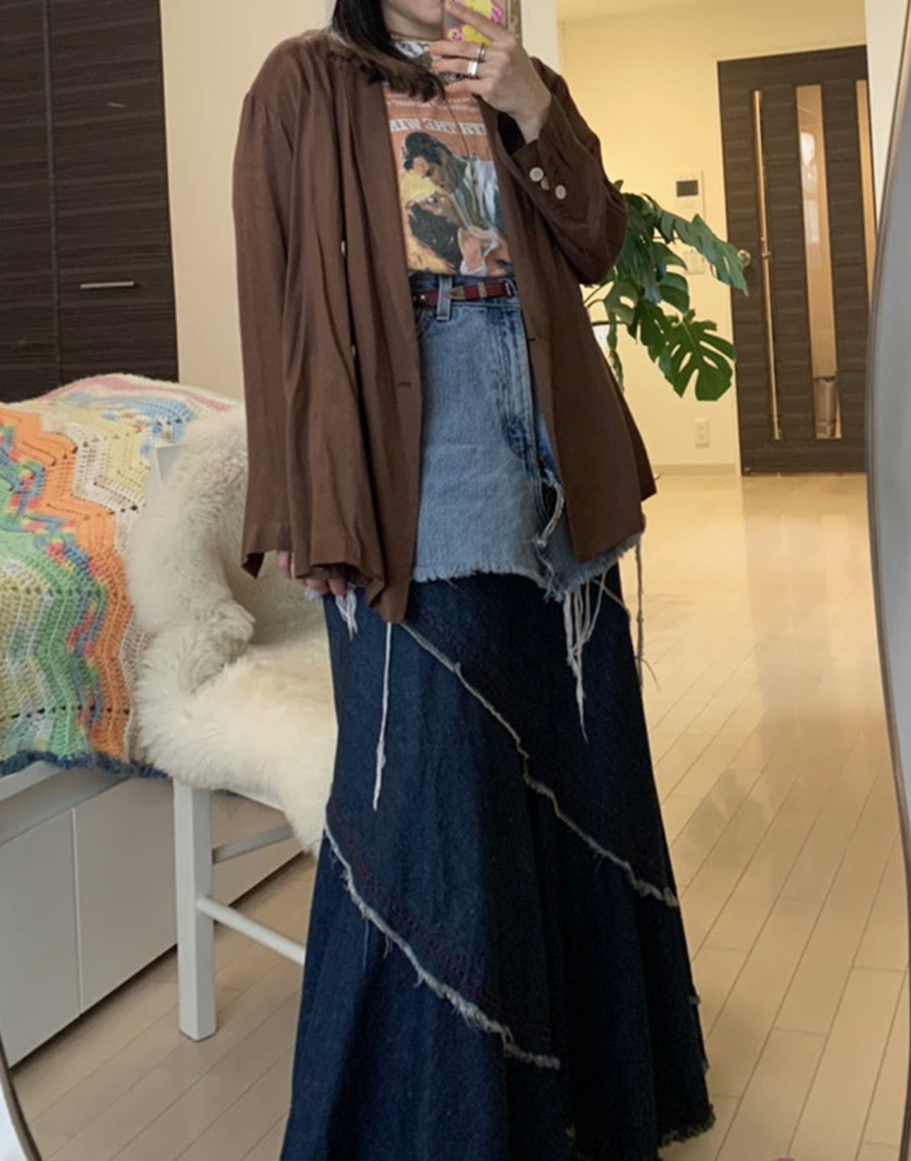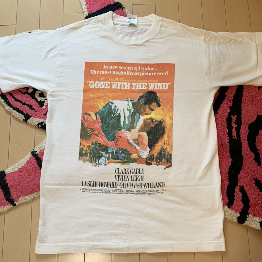 「風と共に去りぬ」のTシャツは、映画のイメージ的にレディースっぽく合わせてます! またTシャツを見せるだけでは物足りなかったのでボトムスをデニムの重ね着にしてシンプルになりすぎないようにしました!