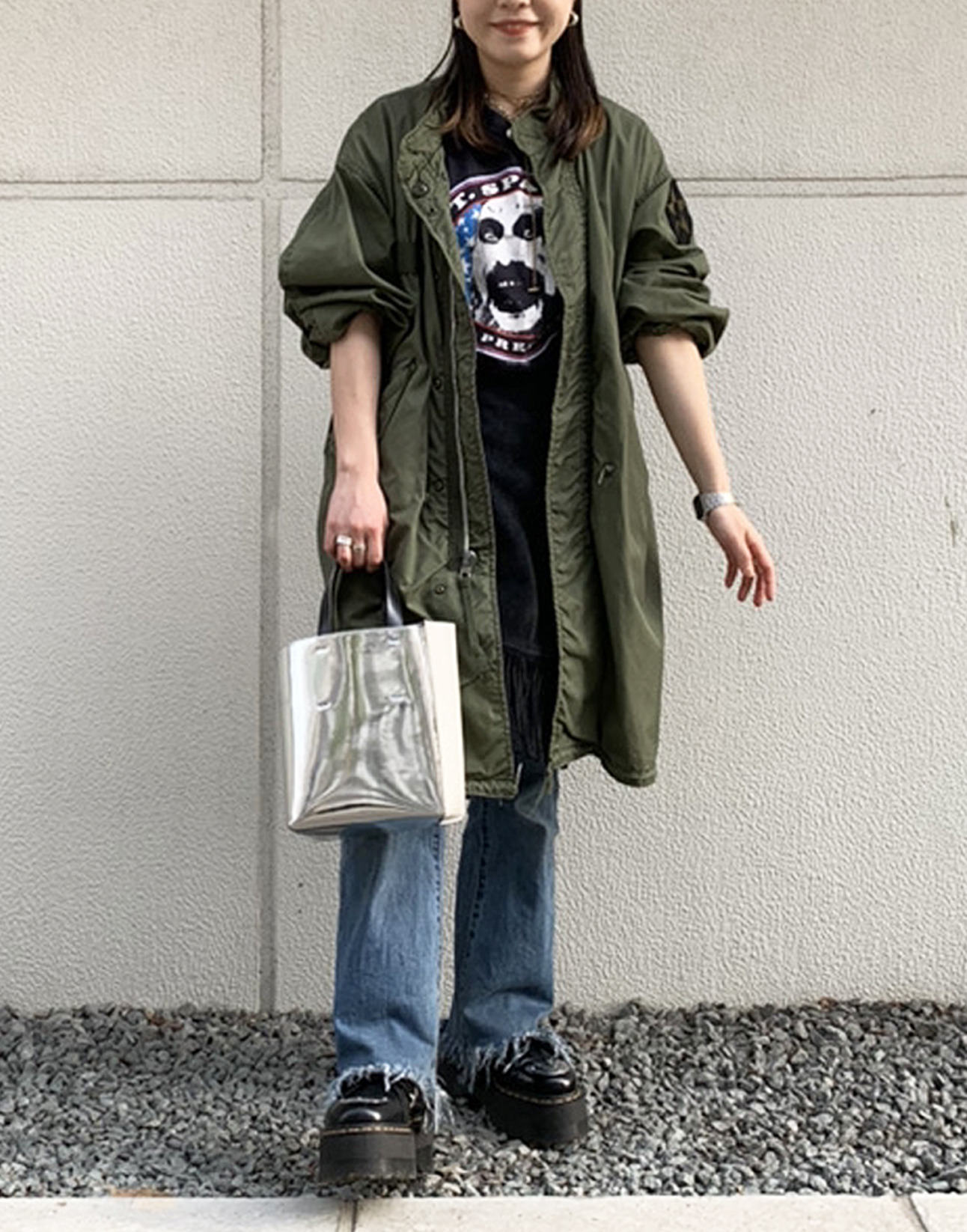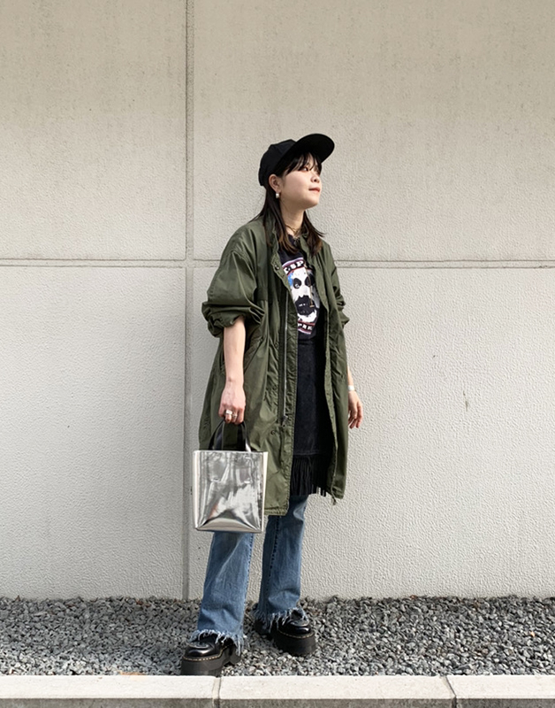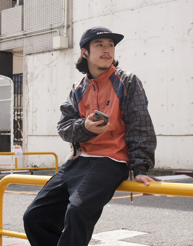 春っぽいオレンジの色味が気分だったのと、ナイロン素材のアイテムなのでテック系のコーデに使えると思ったからです。