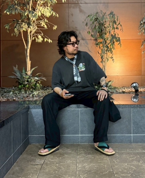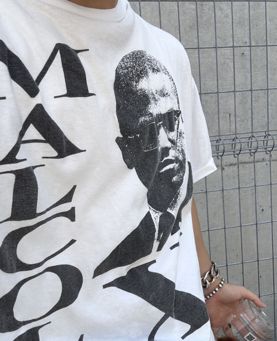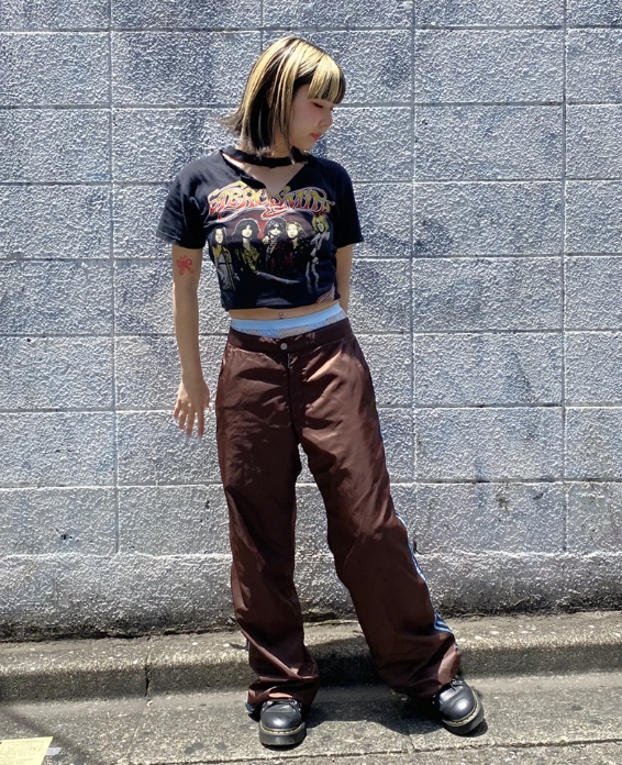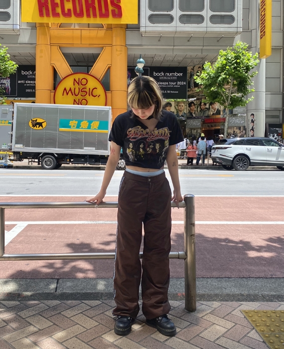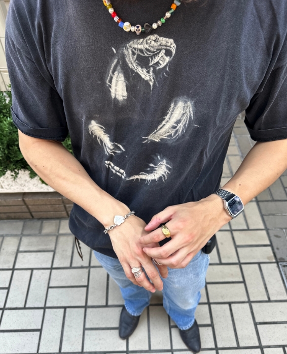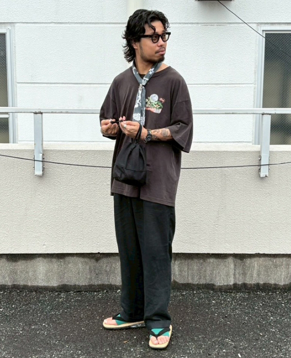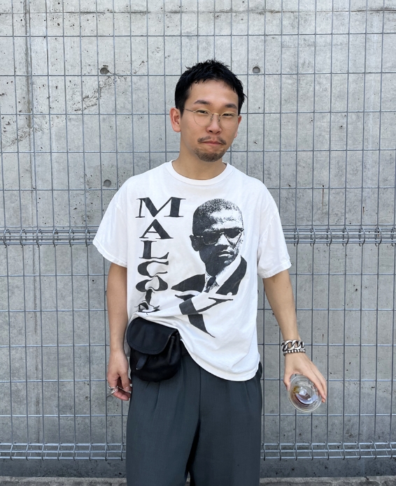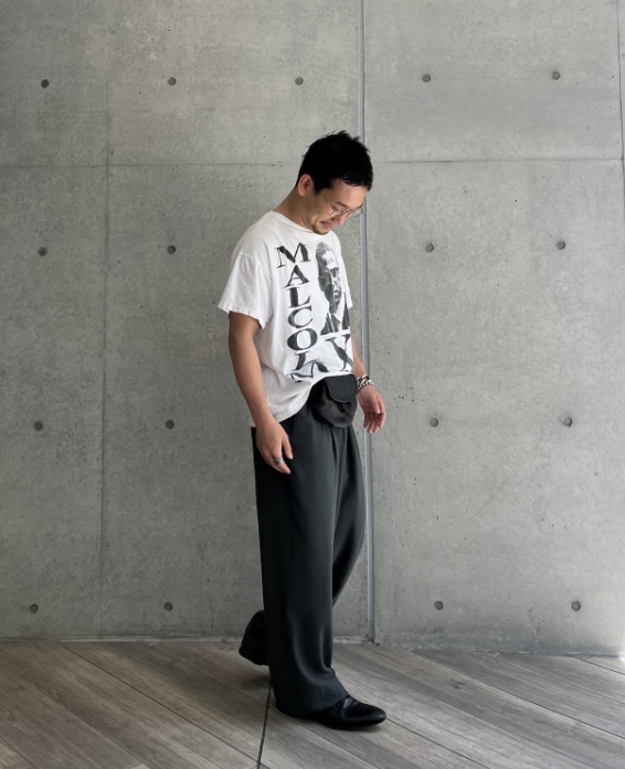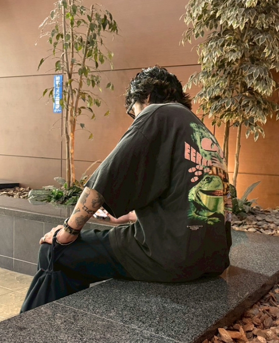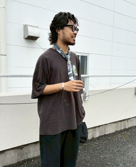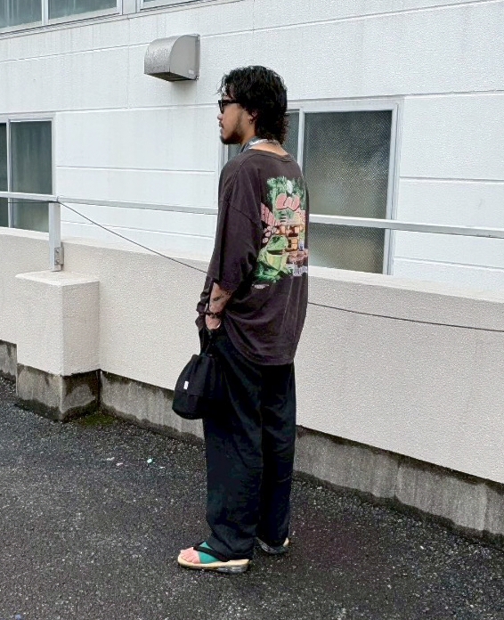 1枚で決まるTシャツなので他はシンプルに。サイズが大きいのでパンツはワイドなシルエットで。ロンTやフーディとのレイヤードもオススメです。