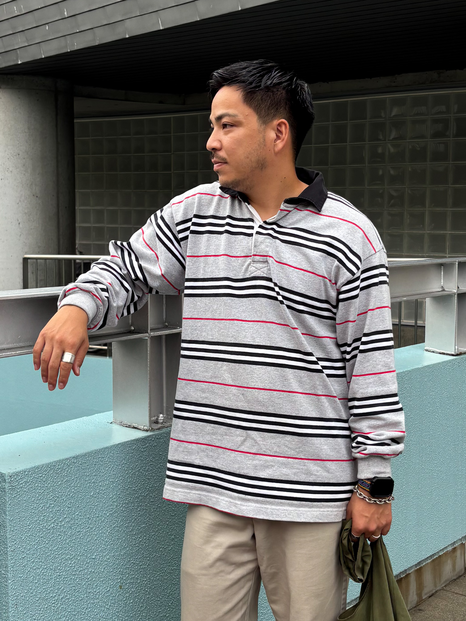 グレーのメインカラーに黒/赤/白のボーダーが落ち着いていて良いなと思いました。30代になり少し落ち着いた色調の服が好みになりました。昔なら太ボーダーの青/オレンジとかチョイスしていましたね。